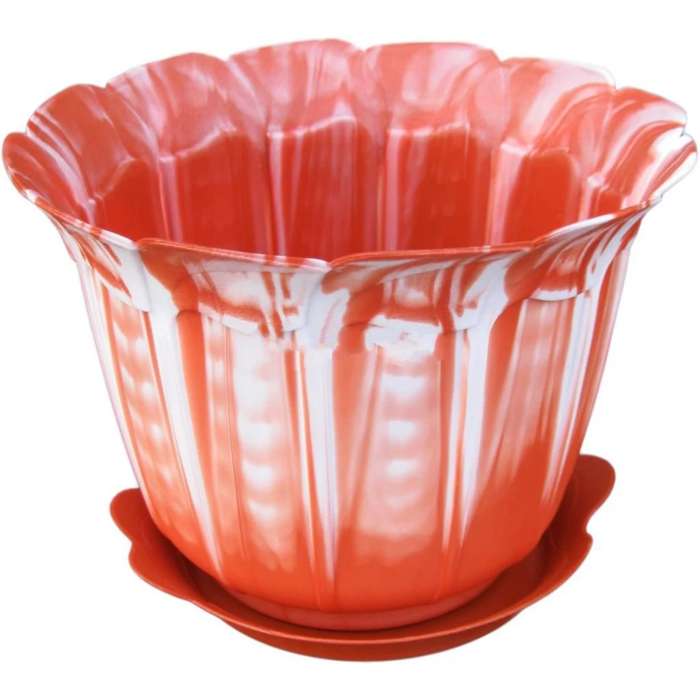 Цветочный горшок объёмом 2,5 л с подставкой бело коричневого цвета имеет декор в виде цветка. Цветочный горшок очень удобный, легкий и практичный, в горшке на дне нет дырок для стока воды, дырки можно проделать самим очень легко и быстро. Этот горшок подойдет к любому вашему цветку и в пишется в любой интерьер.