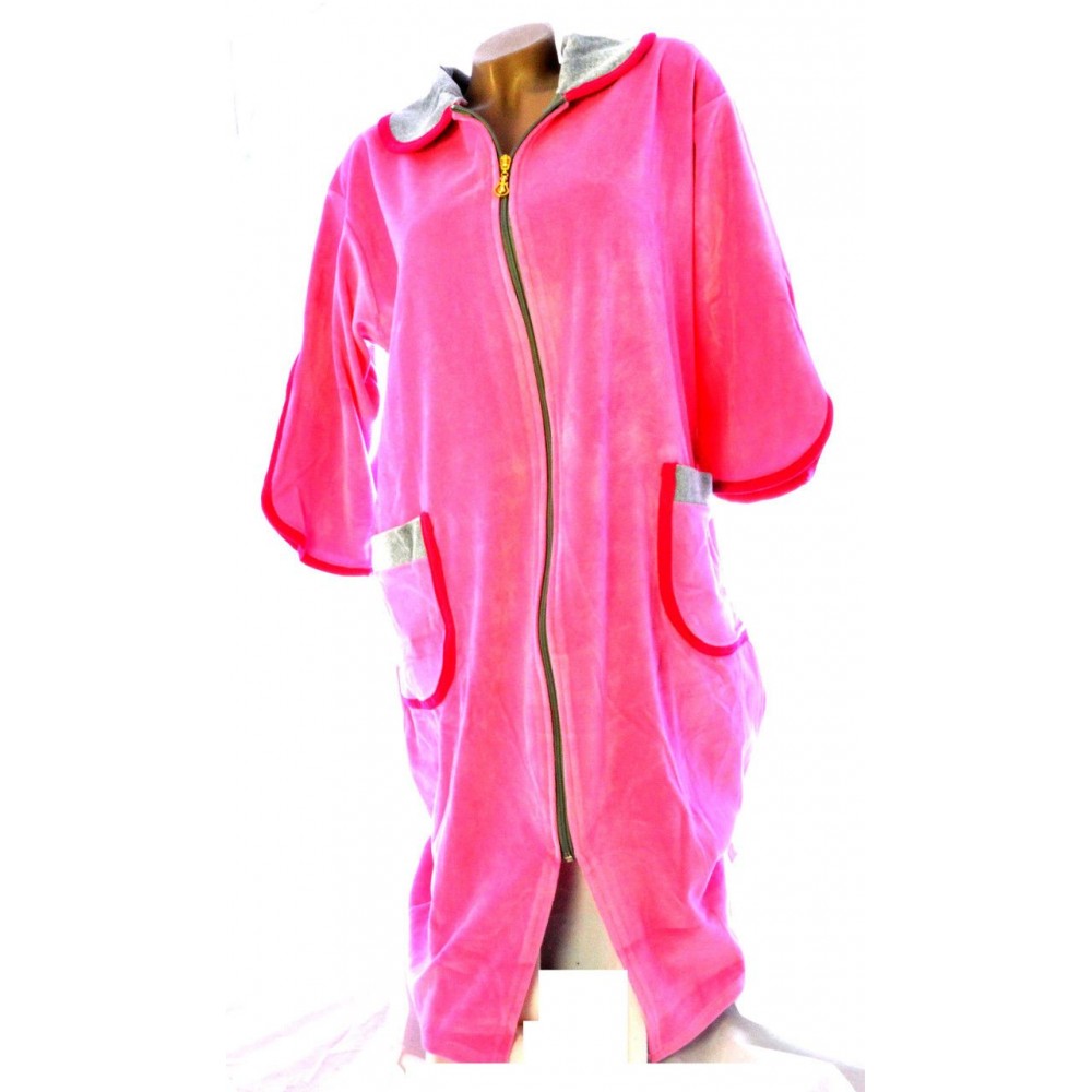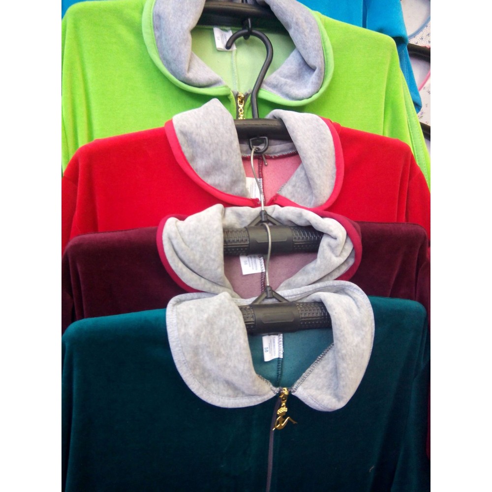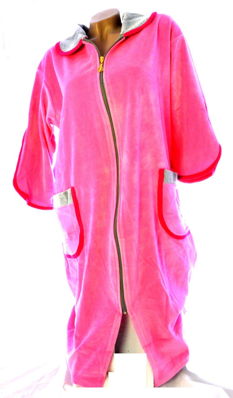 Велюровый халат с рукавом 3/4 с застежкой на "молнии". Яркий халат для женщин с размером от 48-го по 62-й. Цвета в ассортименте. Цена оптовая и розничная зависит от размера халата.