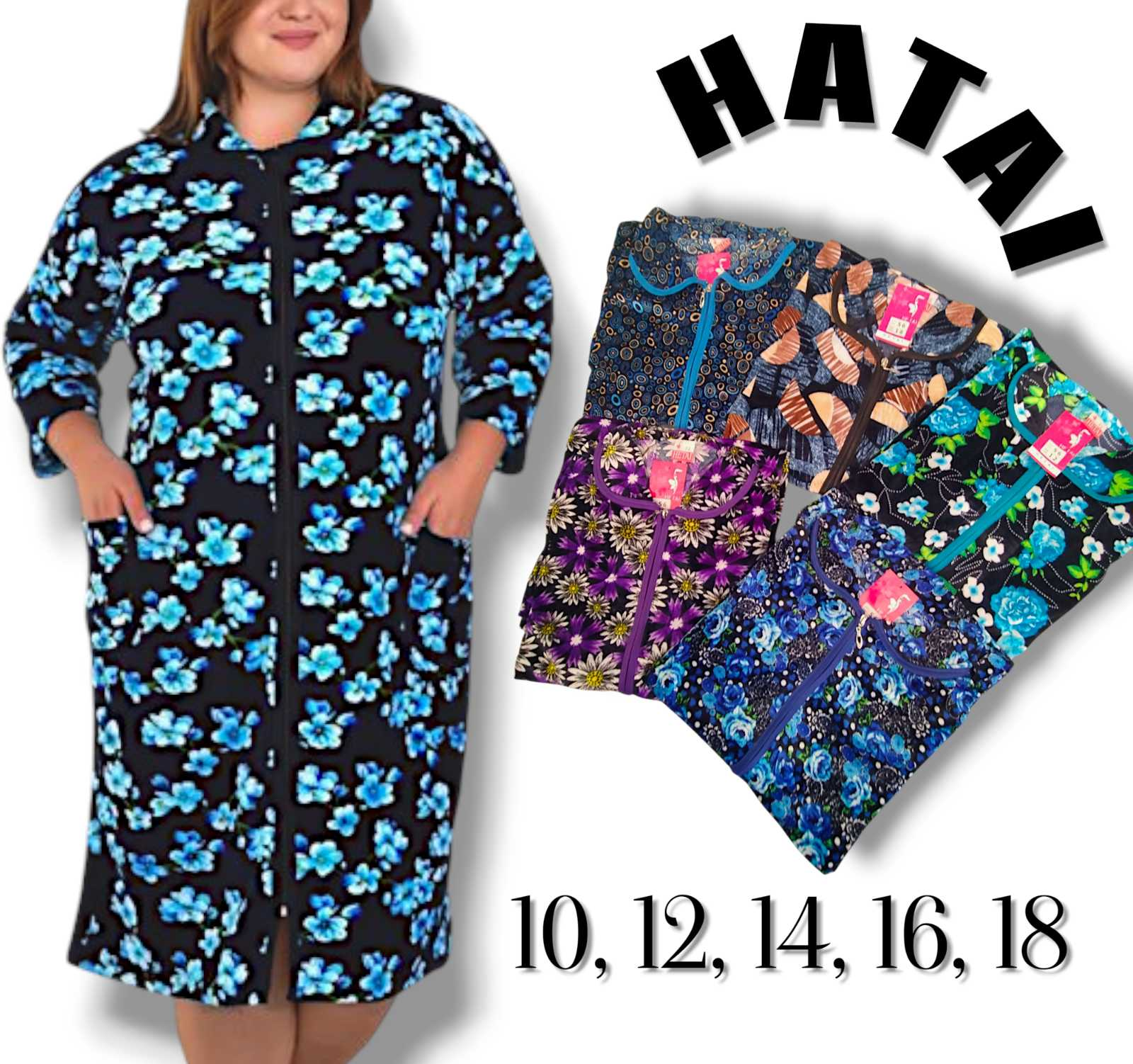 Халат жіночий велюровий. Фірми HATAI. Застібається на блискавку, має дві кишені. Довжина рукава 3/4. Батал. Розміри: 10,12, 14, 16, 18.