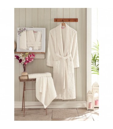 Женский махровый халат Philippus Asiya в комплекте с двумя полотенцами. Надежный турецкий производитель пользуется популярностью на европейском рынке, продукция отвечает высоким стандартам качества и безопасности. В состав изделия входит 100% хлопок, ткань исполнения – двухсторонняя петельчатая махра. Поверхность жаккардовая, с красивым цветочным рисунком. В ассортименте изделия белого цвета, а так же в модных пастельных оттенках розового, голубого цветов. Халат исполнен в классическом стиле, для максимального удобства предусмотрены карманы и широкий пояс. В набор входят два полотенца (лицевое и банное) выполненных в том же стиле. Комплектуется в подарочную упаковку с фирменным логотипом.