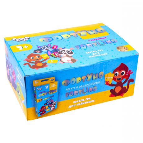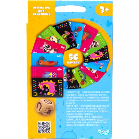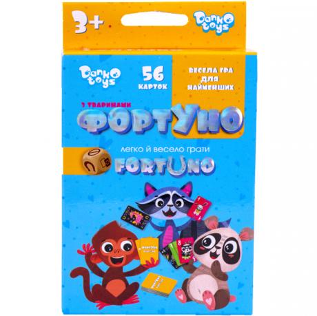 Настільна гра "ФортУно" з тваринами. Весела гра для найменших, вона допоможе розвивати уважність і швидкість реакції у дітей, а також вивчити числа від 0 до 9. Мета гри-якомога швидше позбутися усіх карт. Важливо враховувати схожість кольорів, зображених цифр і тварин. Особливістью гри є наявність кубика із зображенням додаткових завдань для учасниківа і сцеціальної карти "ФортУно".в наборі 56 карток. Розмір 13х9х2,5см. Вік 3+