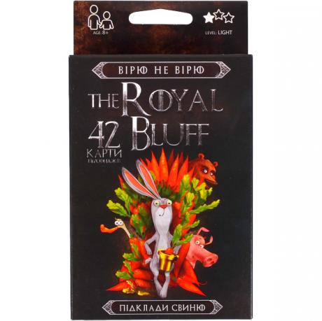 Карткова гра "The ROYAL BLUFF" украинське оформлення. Настільна гра в карти "вірю не вірю" для тих, хто любить ризик, азарт і веселощі. Призначена для веселого проведення часу і спілкування. Вік +8 років. Комплект містить ігрові картки 42шт, правила гри. Розмір упаковки 13*9*2,5см