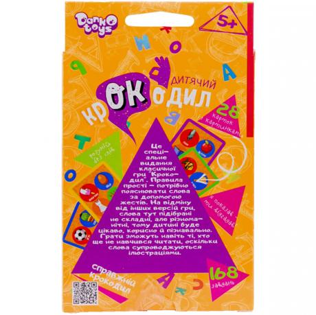 Настільна гра вікторина "Дитячий крокодил" Це спеціальне видання класичної гри "Крокодил" Правила прості, потрібно пояснювани слова за допомогою жестів. На відміну від інших версій гри, слова тут підібрані не складні, але різноманітні, тому дитині буде цікаво, корисно й пізнавально. Грати можуть навіть ті, хто не навчився читати, оскільки слова супроводжуються ілюстраціями. Містить 28 карток із картинками,168 завдань. Мова українська.Розмір 13х9х2,5см. Вік 5+