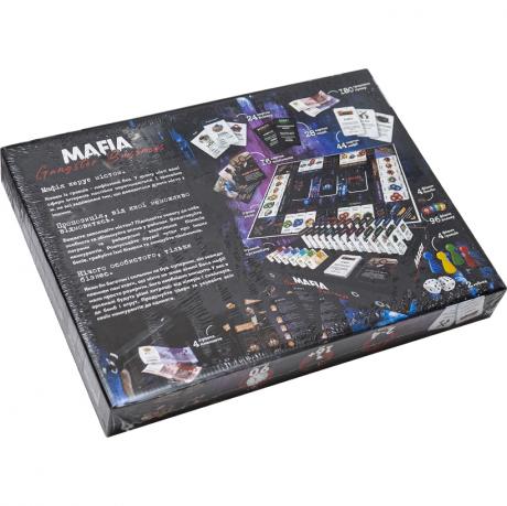 Кожен учасник грає свою, приховану від інших, роль – мафії, шерифа, детектива чи відступника, що створює атмосферу інстриги та психологічної гри. У грі все вирішують кидок кубика та фортуна, а карти зброї, автомобіля чи точного пострілу додадуть бонуси, які можуть стати вирішальними на шляху до перемоги. Комплектація: - граве поле 1шт., 96 фішок впливу, 4 фішки граків, 2 кубики, 180 купюр, 112 карт правила гри - 1 шт. Розміри упаковки 40х30х5см. К-ть граків 2-4. Середній час гри – 90 хвилин. Вік 16+