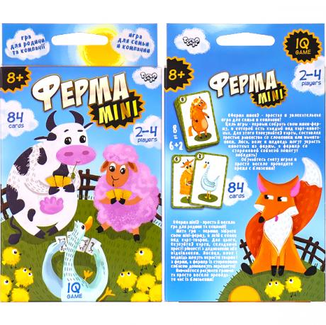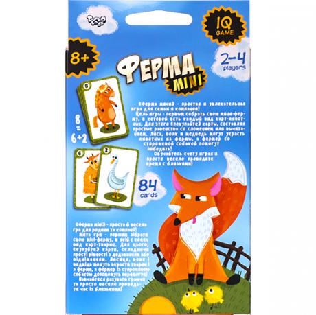 Ферма міні-проста і весела гра для сім'ї та компанії! Мета гри-першим зібрати свою міні-ферму, в якій є кожен вид карт-жівотних.Для цього купуйте карти, складаючи прості рівності з додаванням або відніманням.Ліса, вовк і ведмідь можуть вкрасти тварин з ферми, а фермер із сторожовою собакою допоможуть перемогти. Вчиться рахувати граючи і просто весело проводьтє час з близькими. В наборі 84 картки. Кількість гравцем: 2-4 чол. Розмір упаковки: 13,5х9х2,5 см.Вік 8+