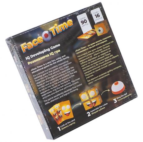 Настільна гра "Face Time" включає 90 карток, 16 кубиків, 1 дзвіночок та правила. Гра розрахована на 2-4 гравців. Мови: українська та англійська. Розмір упаковки 25х25х4 см. Рекомендується для дітей віком від 4 років.