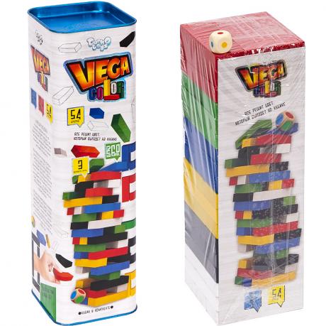 Розвиваюча настільна гра ""VEGA COLOR" Всі бруски пофарбовано в 6 кольорів. Гравці по черзі кидають кубик і виймають із вежі бруски того кольору, який випав на кубику, головне завдання-не допусстити обвалу вежі, інакше програєшь. В набір входить :41кубик, 54 бруски. Для 2-х гравців. Розмір 30х8,5х8,5.Вік 5+