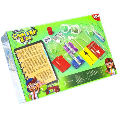 "CHEMISTRY KIDS" CHK-01-01U - це освітній набір для проведення безпечних наукових дослідів. Він дозволяє дітям від 10 років вивчати науку через практичний досвід. Кожен дослід може стати цікавим шоу. Розмір упаковки становить 34 х 23 х 8,5 см.