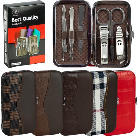 До манікюрного набору входять манікюрні ножиці, кусачки для нігтів, мінікусачки для кутикули, пінцет, пилка для нігтів, двосторонній пушер (лопатка) для обробки кутикули та інструмент для очищення нігтів від забруднень. Усі інструменти виготовлені з нержавіючої сталі та підходять для базового догляду за нігтями в домашніх умовах.
