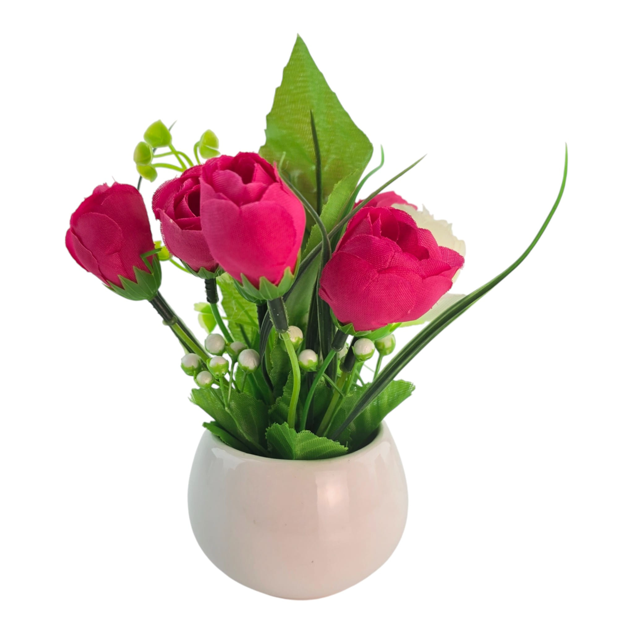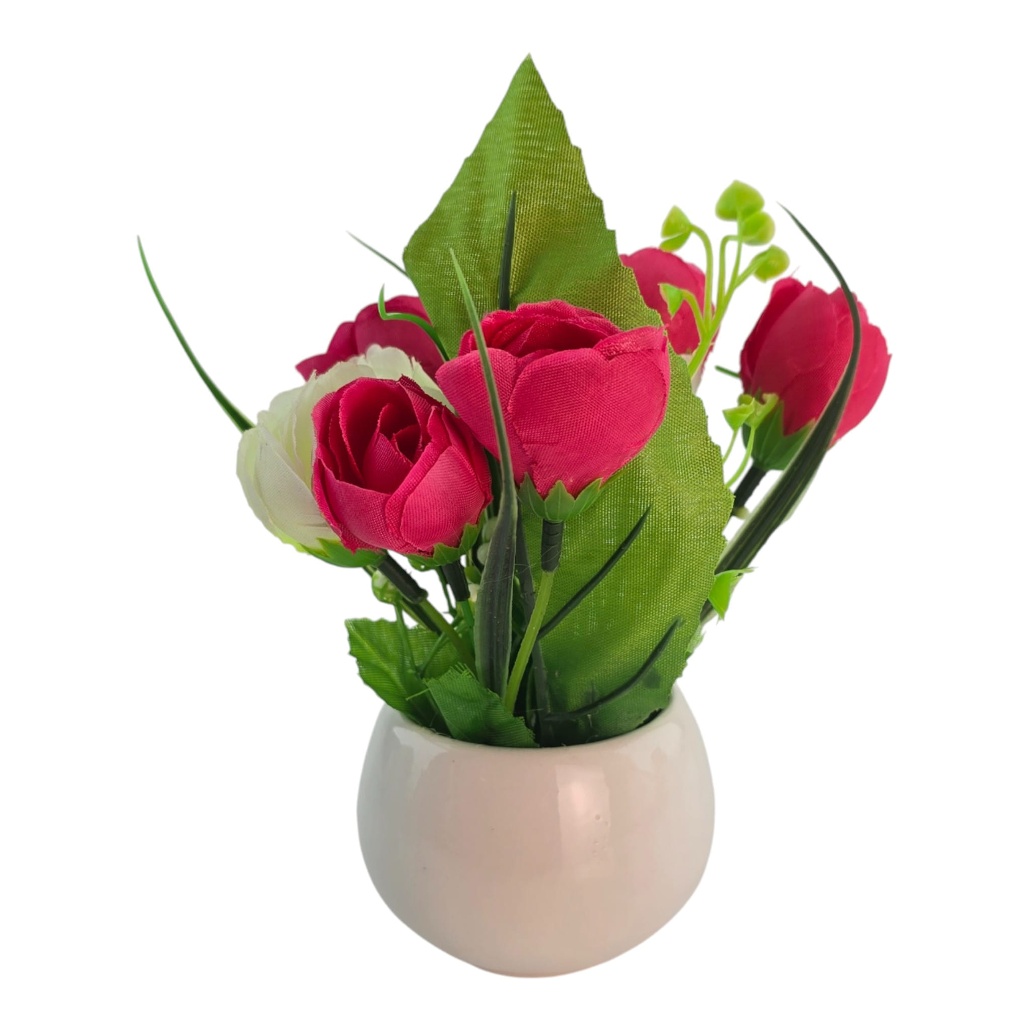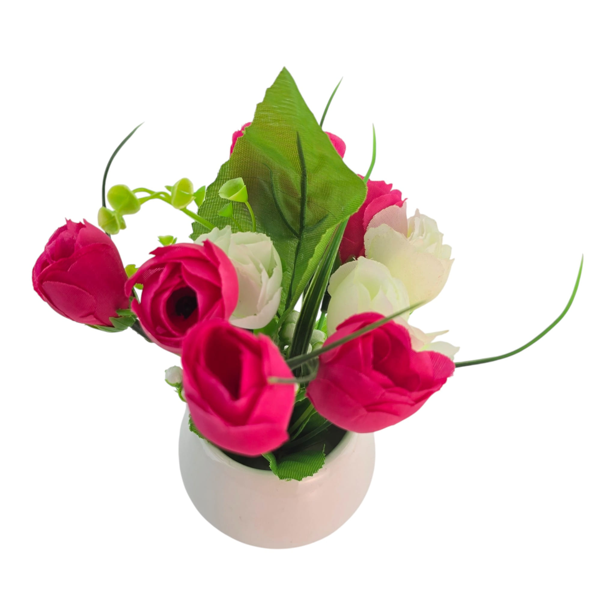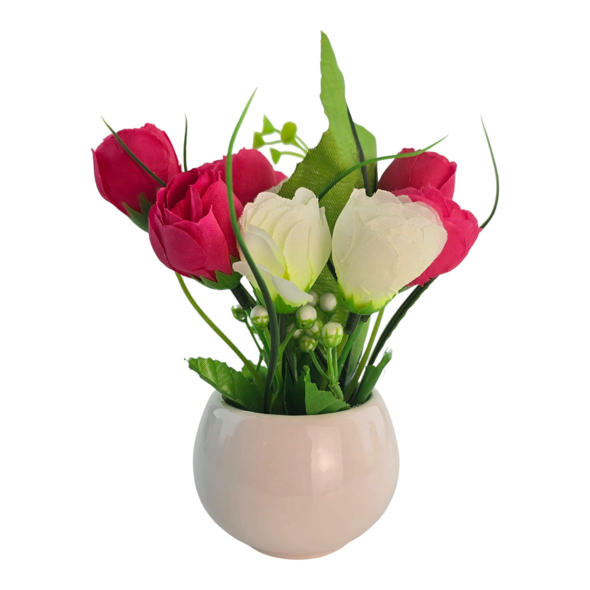 Настольная цветочная композиция в белом керамическом кашпо - аккуратный декор без полива и ухода. Красные и белые бутоны дают яркий, но спокойный акцент, а зелень добавляет объема. Компактный формат удобно поставить на стол, подоконник, полку или стойку ресепшн. Подходит для дома и офиса, а также в качестве небольшого подарка.