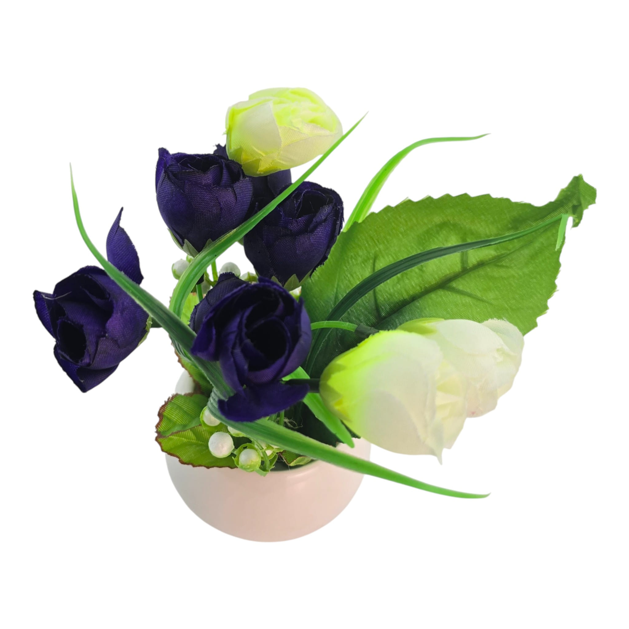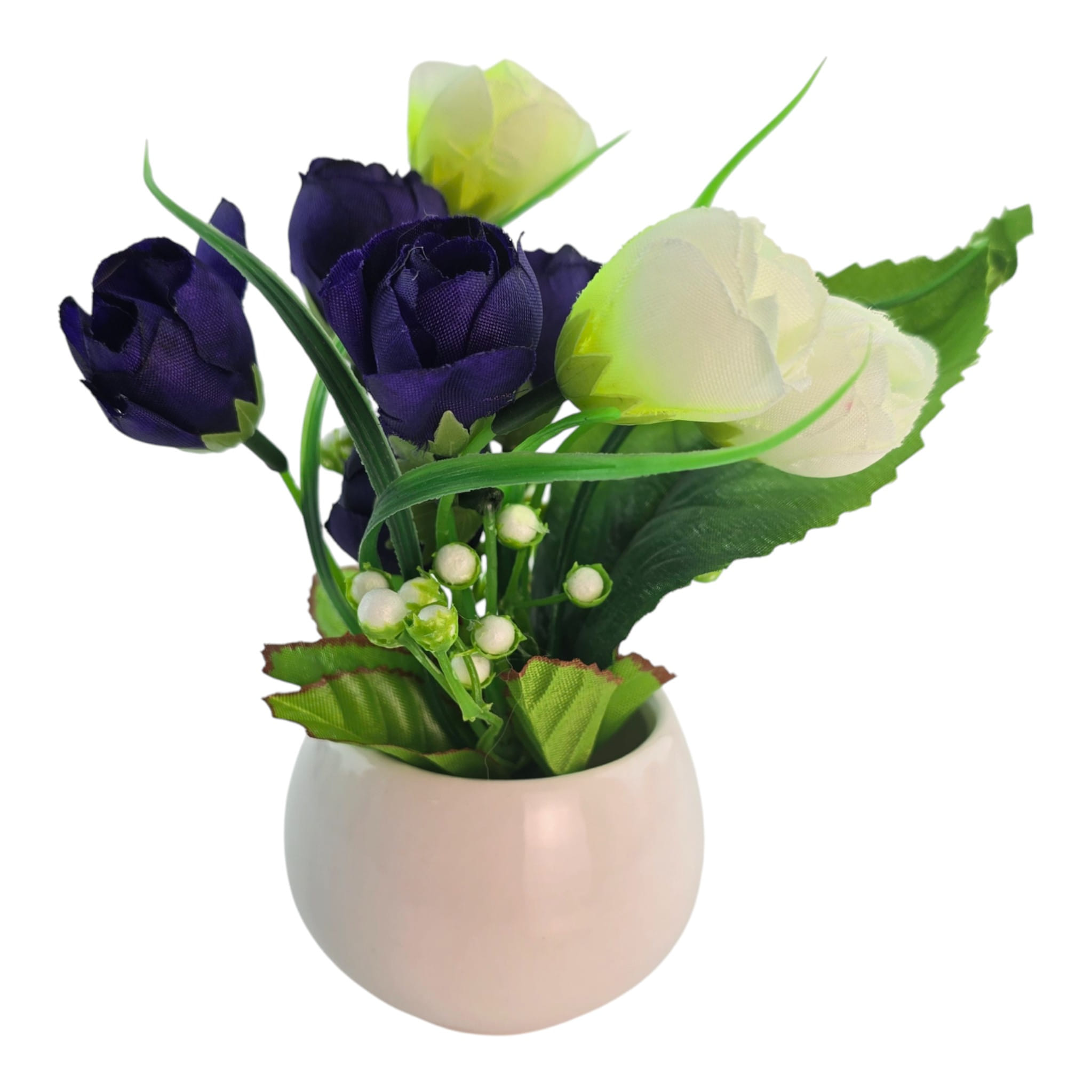 Настольная композиция в белом керамическом кашпо - спокойный декор без полива и ухода. Темно-синие бутоны с белыми акцентами смотрятся сдержанно и аккуратно, хорошо подходят под современный интерьер. Компактный размер удобно поставить на рабочий стол, тумбу, подоконник или полку. Подходит для дома, офиса и в качестве небольшого подарка.