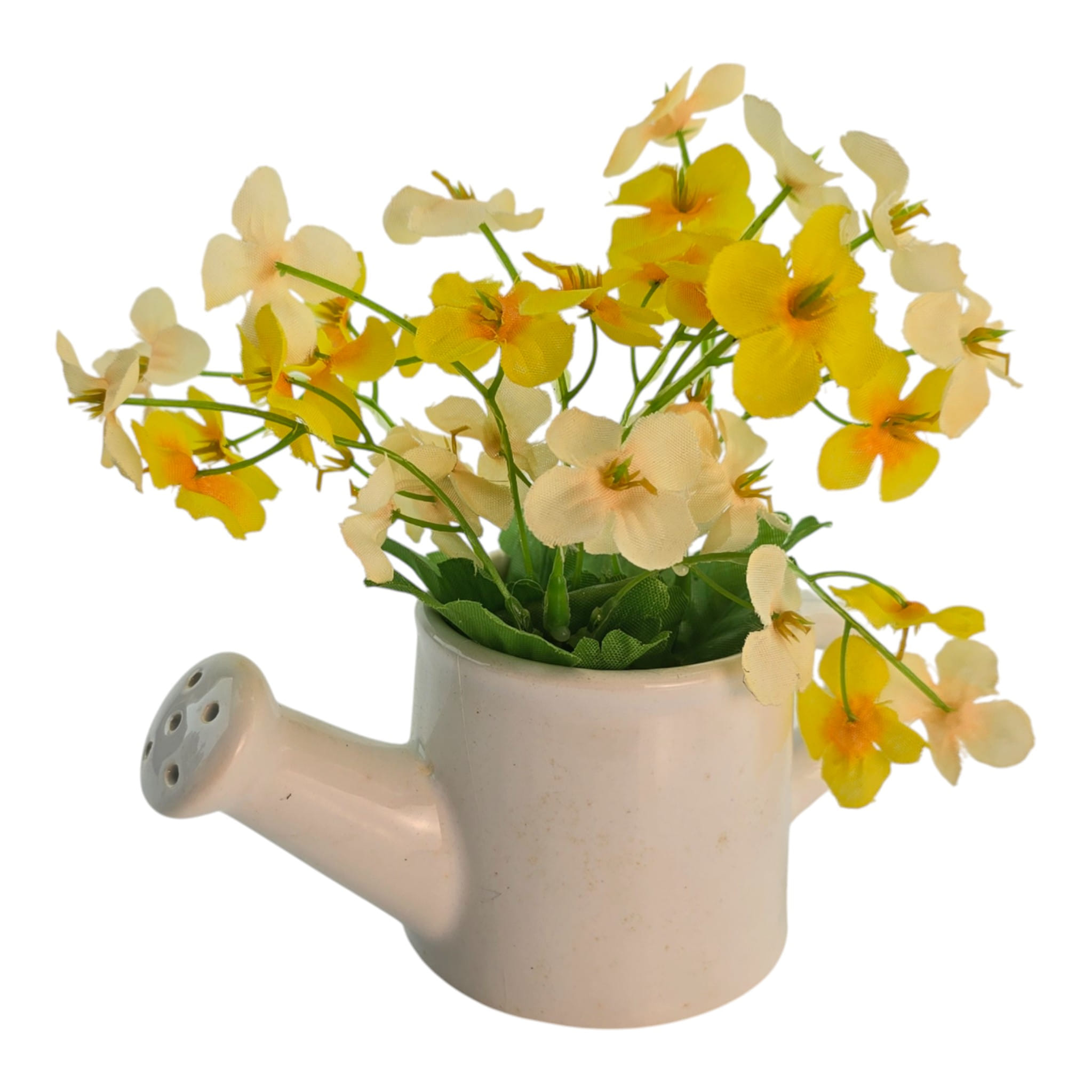 Цвет: лейка белая, цветы желтые и кремовые, листья зеленые