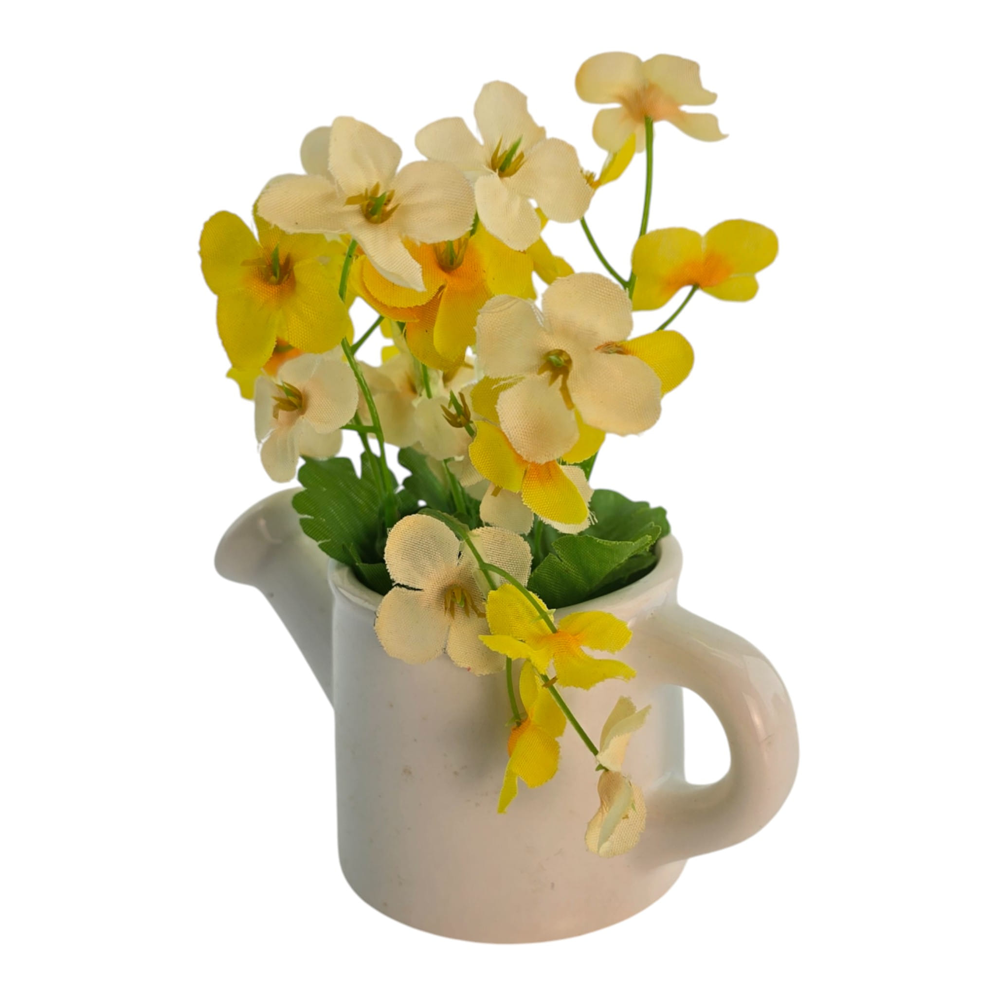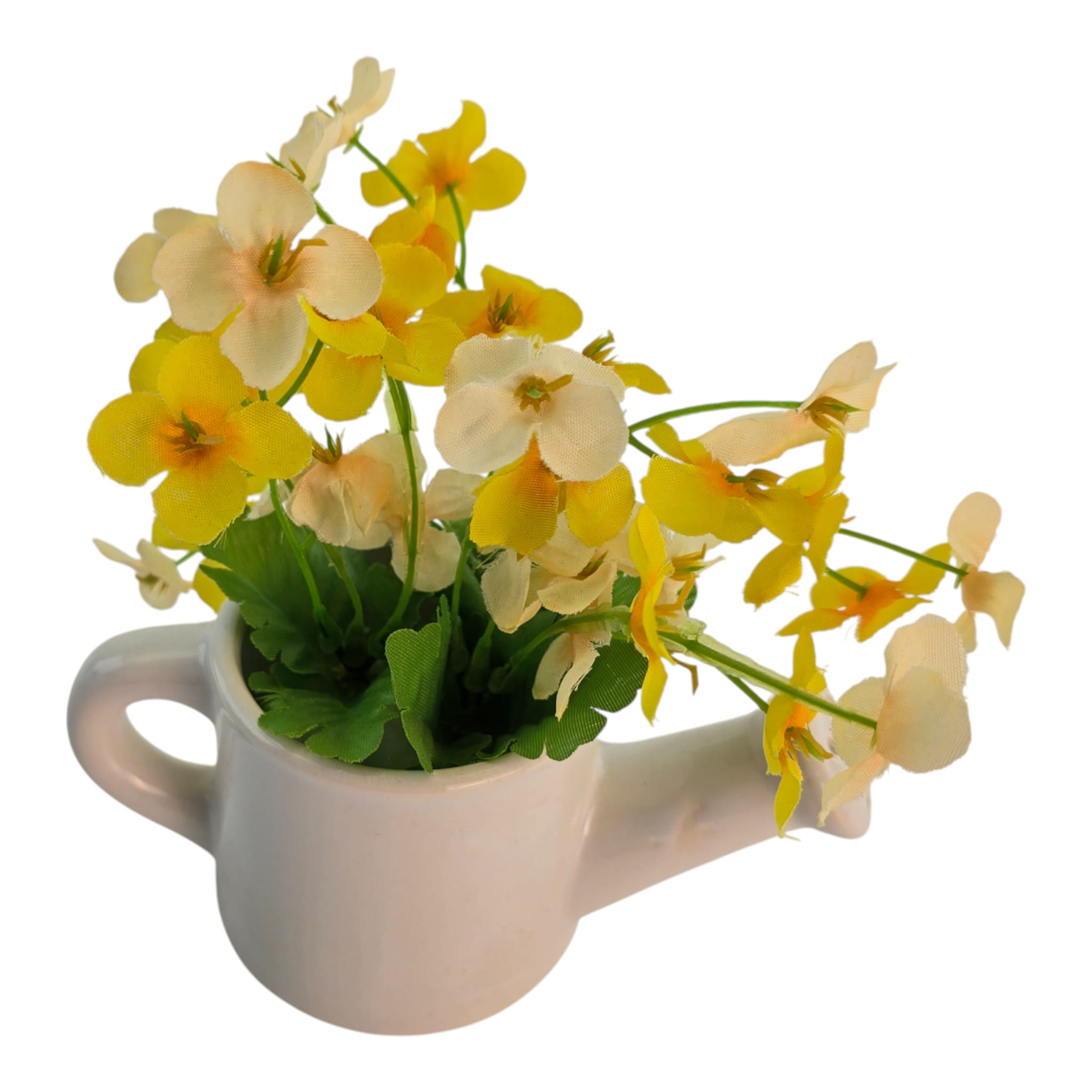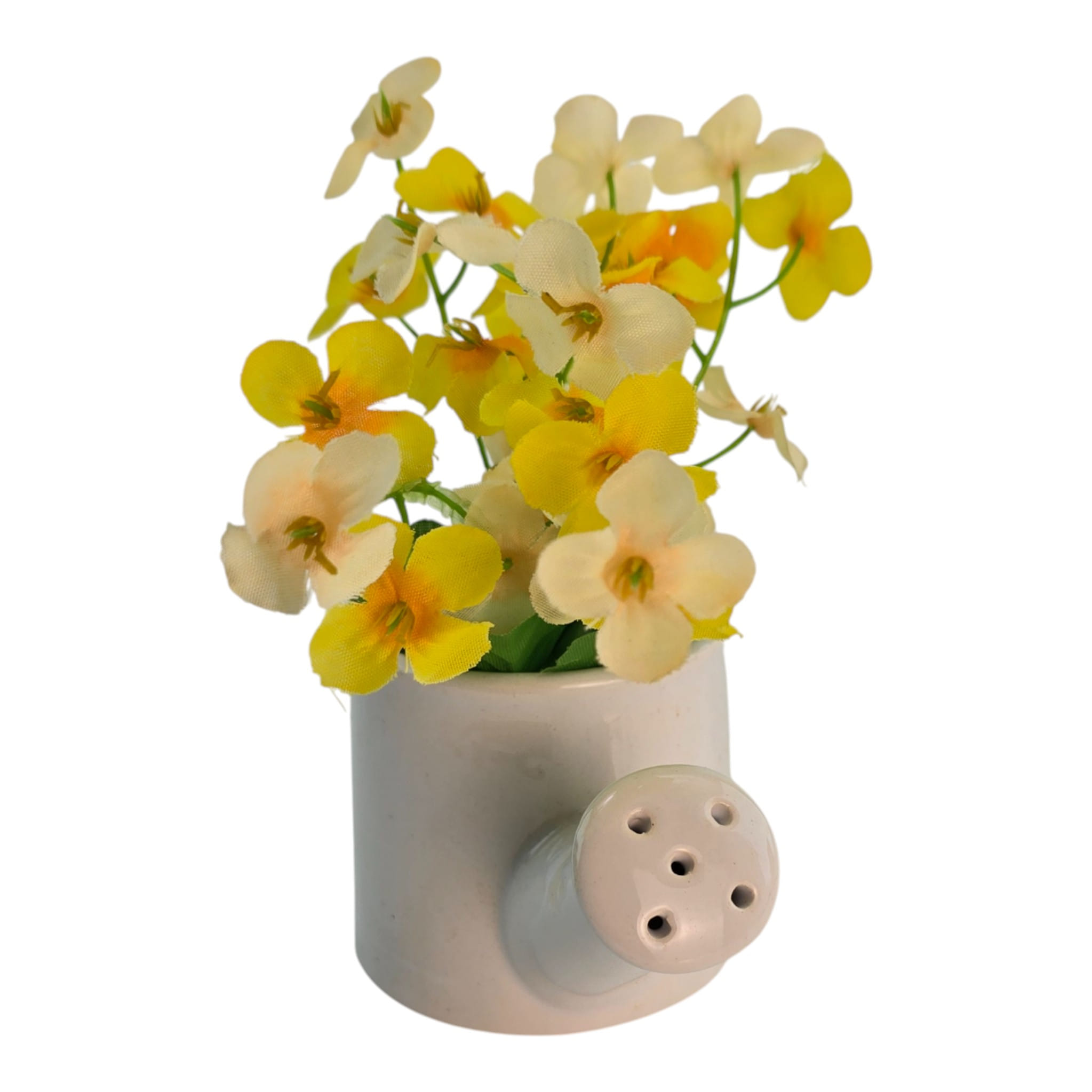 Описание: Декоративная композиция из искусственных цветов в керамической лейке добавляет уюта на кухне, подоконнике или рабочем столе. Цветы в желтых и кремовых оттенках смотрятся свежо и "солнечно", а белая лейка легко вписывается в разные интерьеры. Компактный размер удобен для небольших поверхностей и не требует ухода. Носик лейки с отверстиями делает композицию узнаваемой и добавляет интересный акцент.
