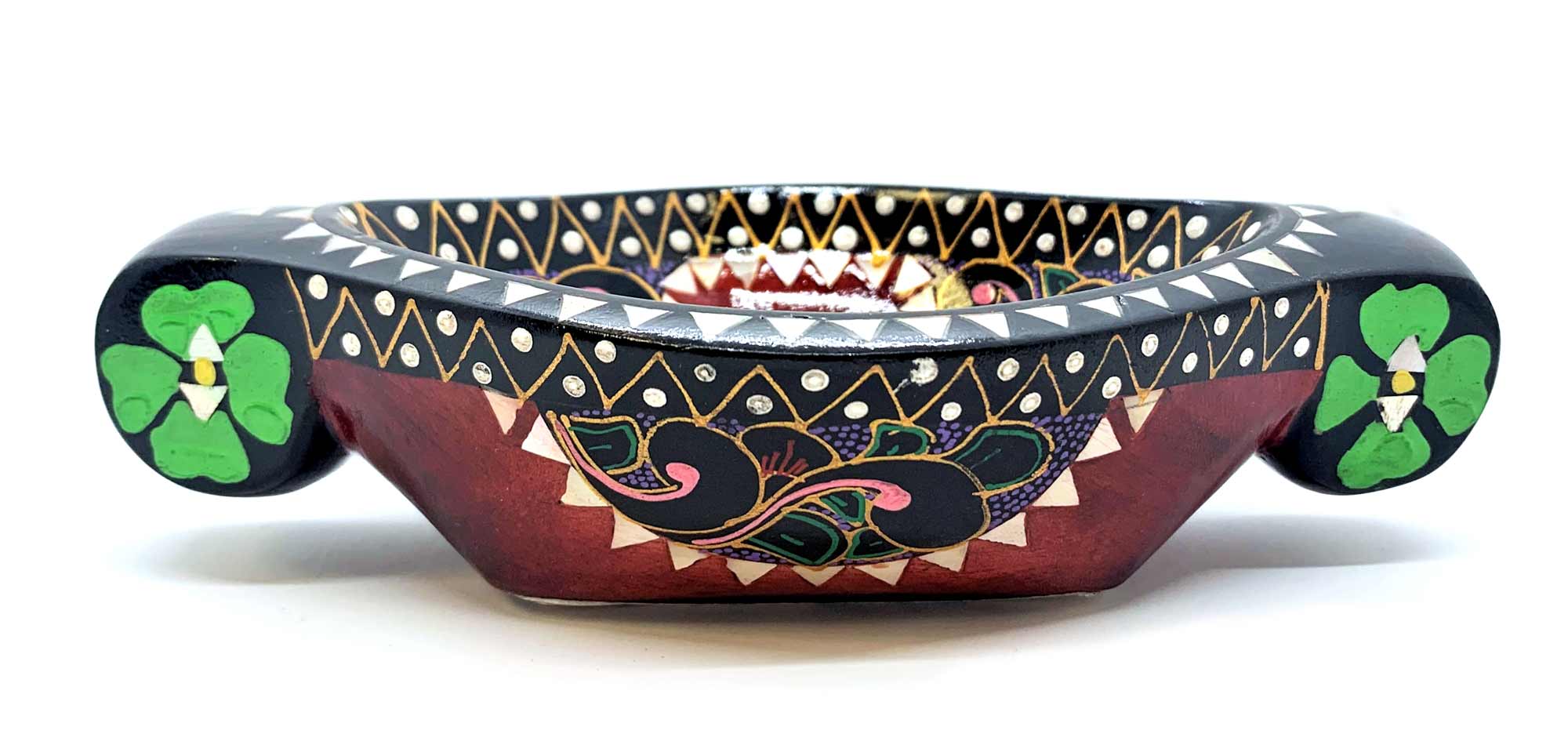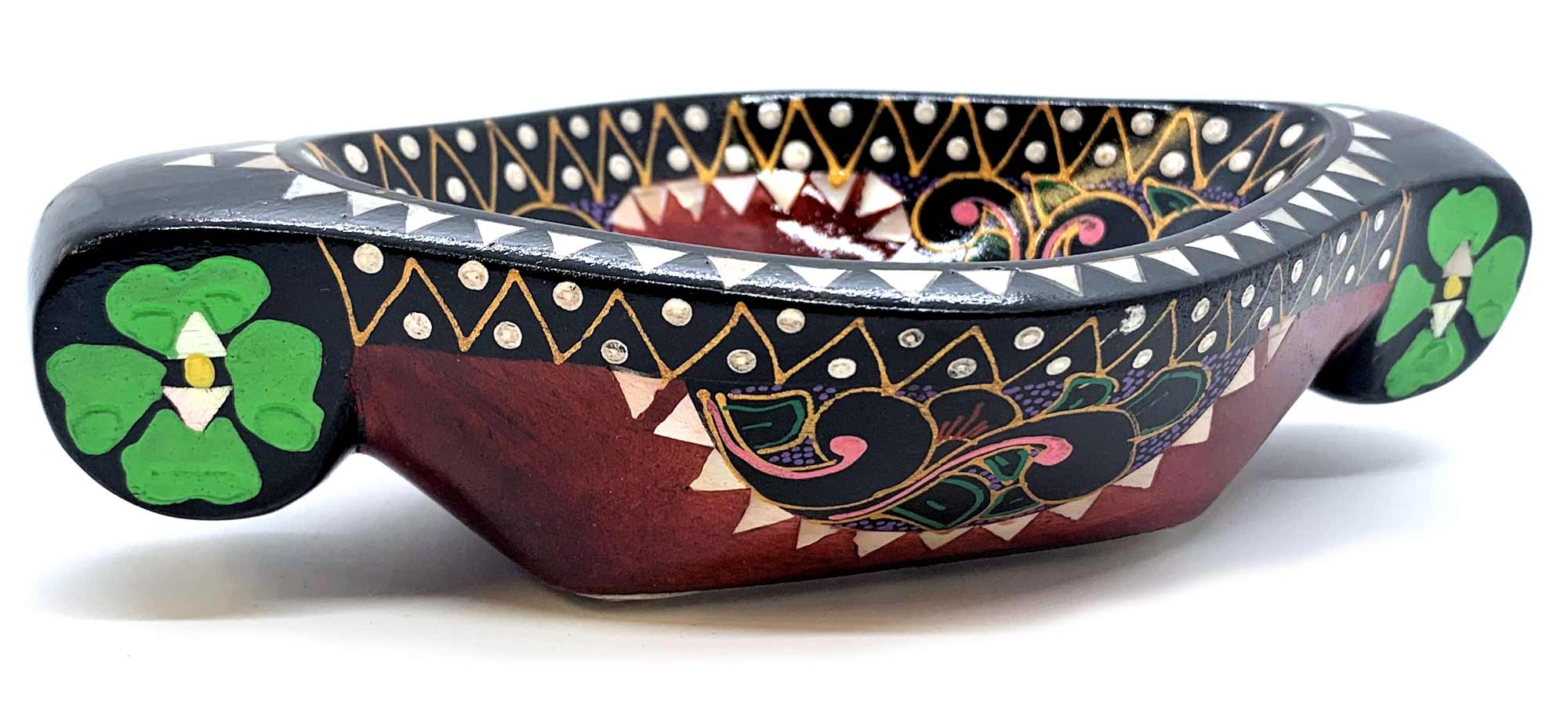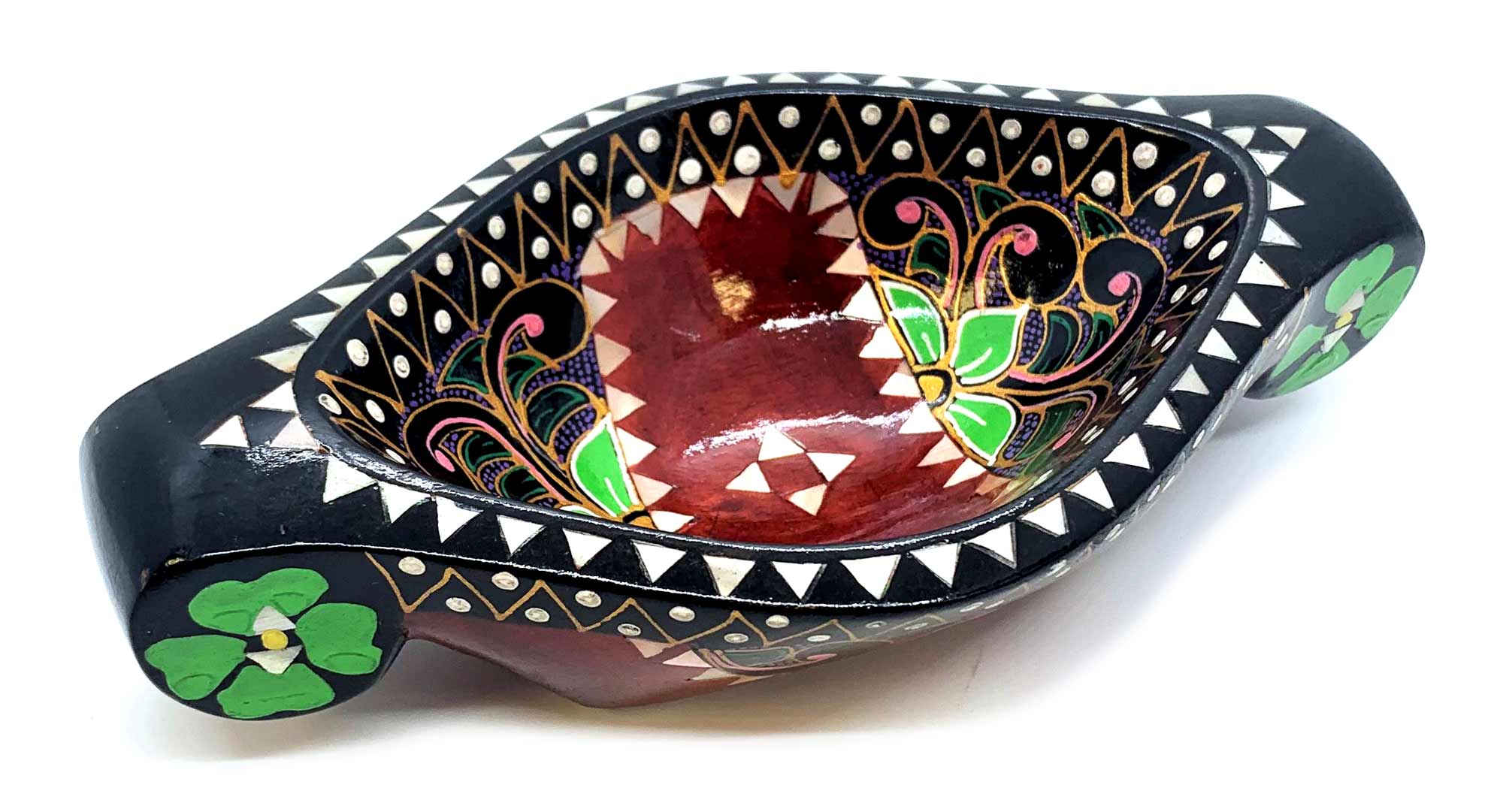 Это восхитительное блюдо для фруктов выполнено вручную в Индонезии на острове Ломбок из цельного дерева и инкрустировано перламутром. Оно имеет яркий красный цвет и украшено росписью вручную с изображением красивых цветов. Размер этого блюда составляет 16 х 10 х 4.5 см, что делает его идеальным для сервировки фруктов и других лакомств. Это красивое и функциональное изделие станет прекрасным дополнением к вашему декору и прекрасным подарком для любителей уникальных предметов.