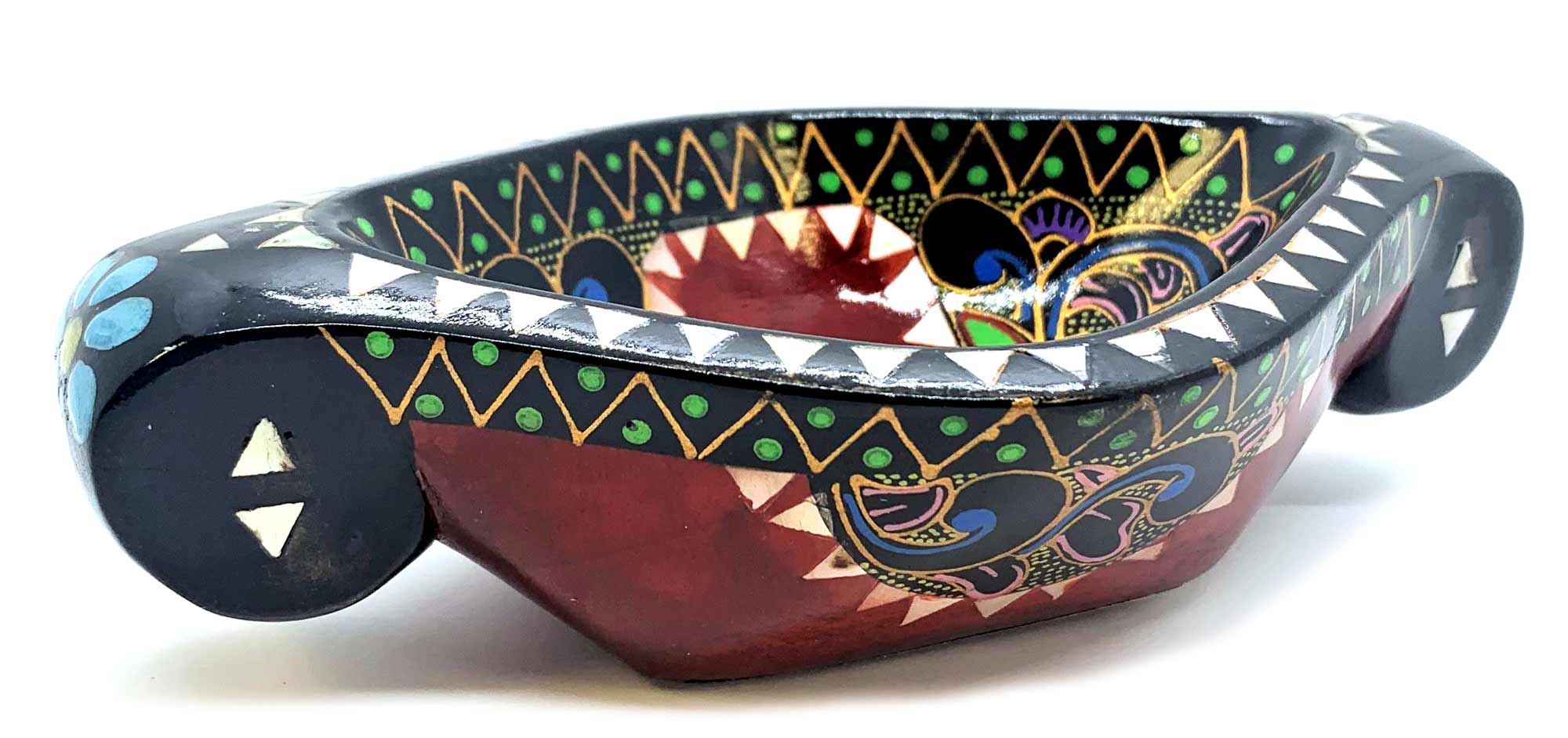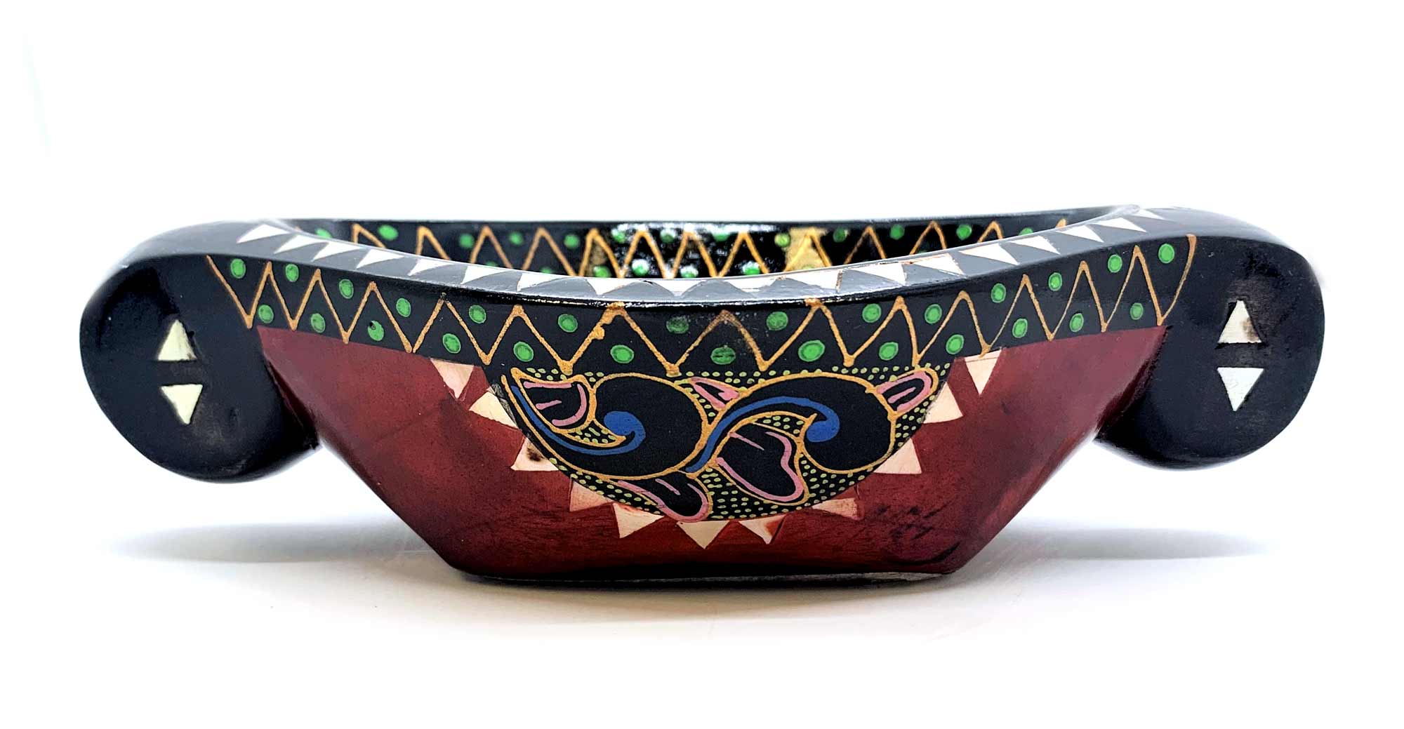 Это восхитительное блюдо для фруктов выполнено вручную в Индонезии на острове Ломбок из цельного дерева и инкрустировано перламутром. Оно имеет яркий красный цвет и украшено росписью вручную с изображением красивых цветов. Размер этого блюда составляет 16 х 10 х 4.5 см, что делает его идеальным для сервировки фруктов и других лакомств. Это красивое и функциональное изделие станет прекрасным дополнением к вашему декору и прекрасным подарком для любителей уникальных предметов.