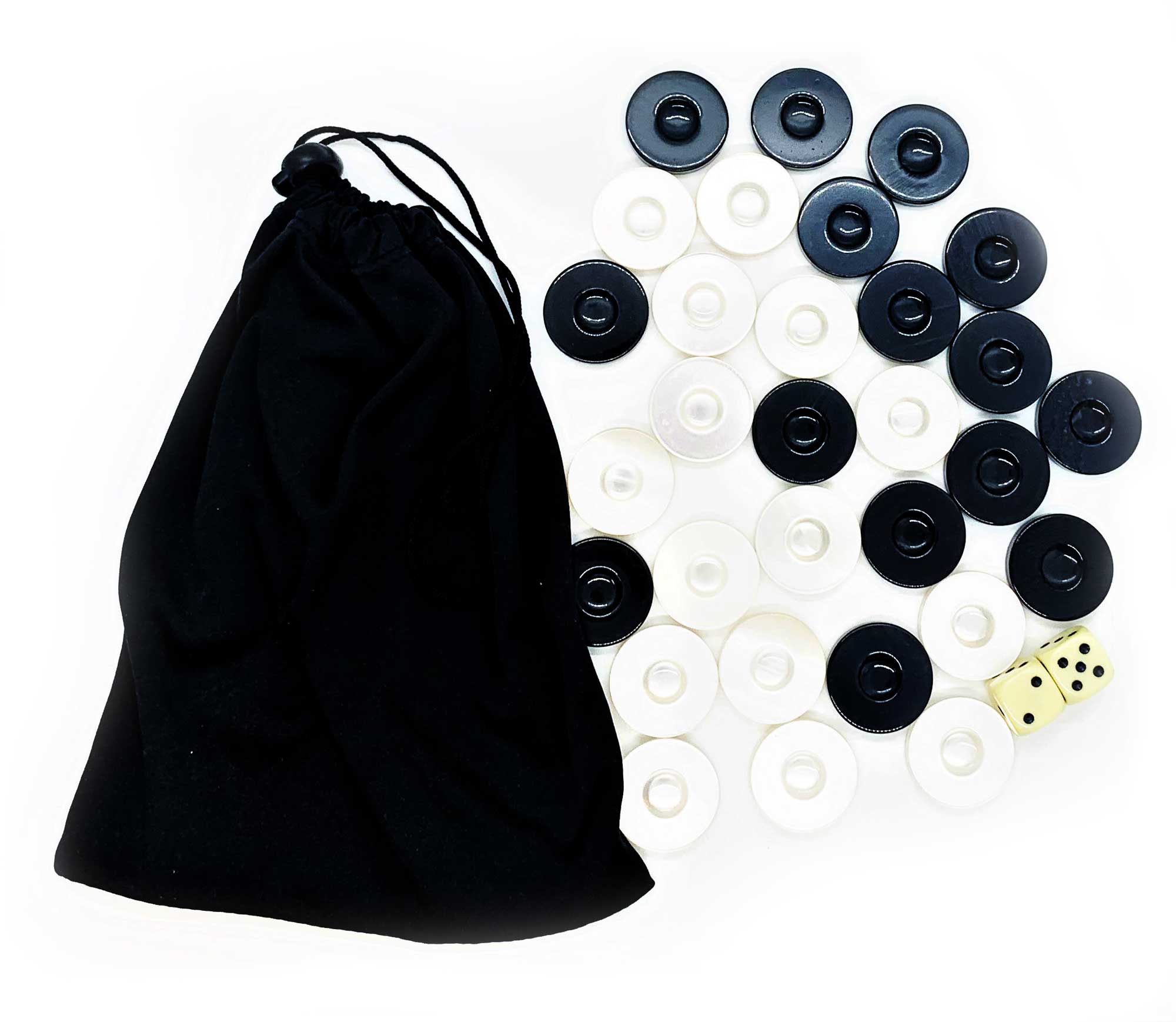 Комплект включает в себя 30 фишек и два кубика, а также мешочек для хранения, который позволит вам сохранить фишки и кубики в безопасности и легко переносить комплект.