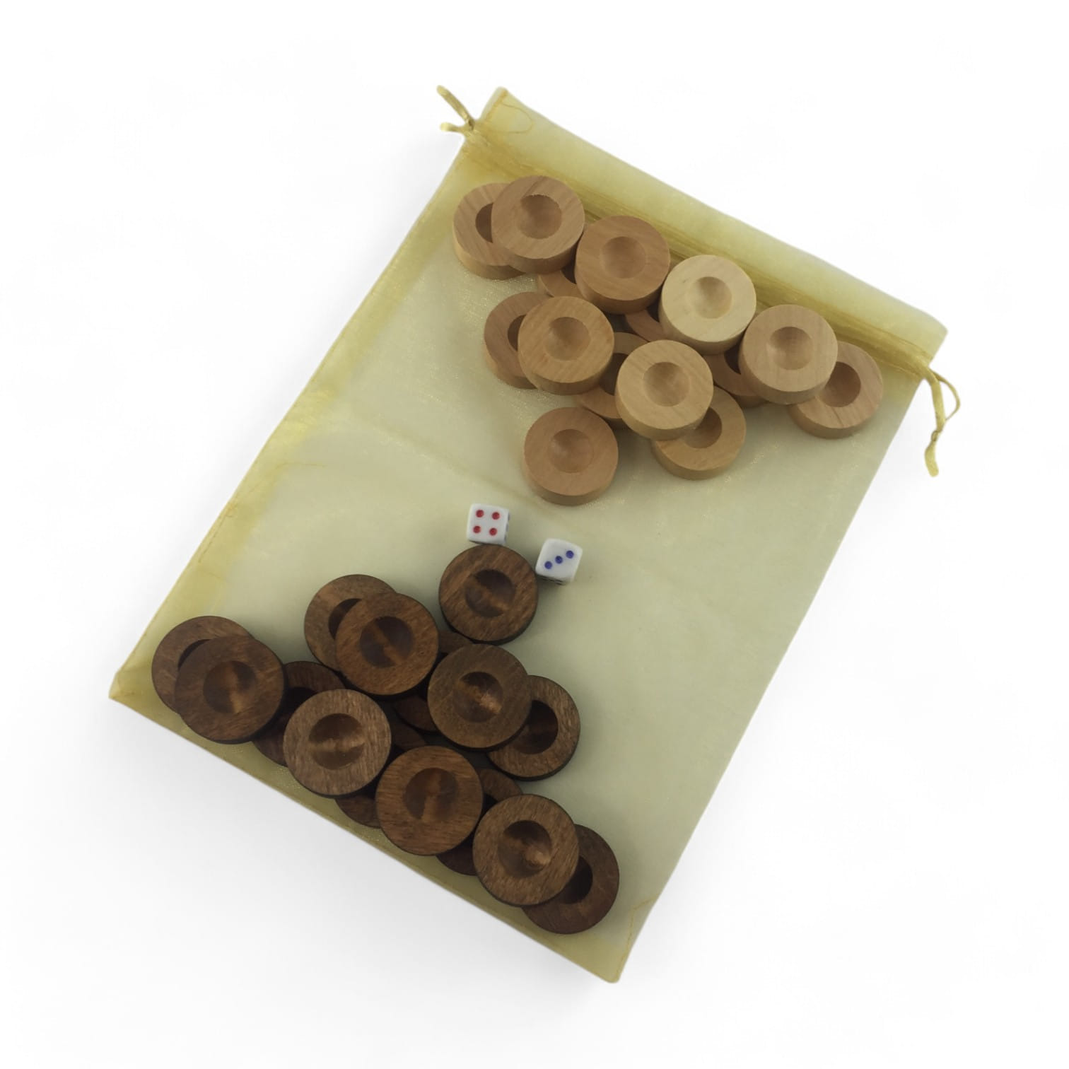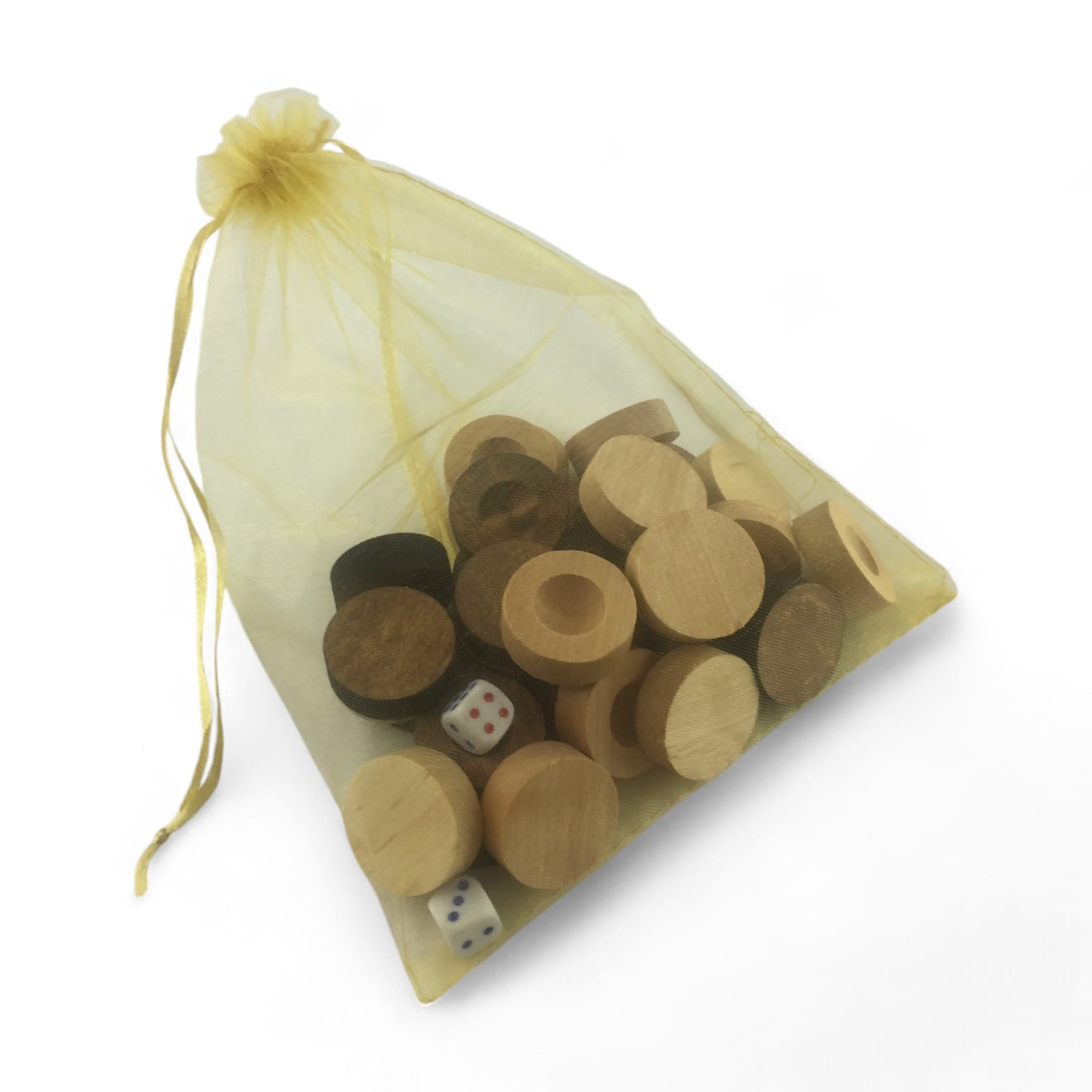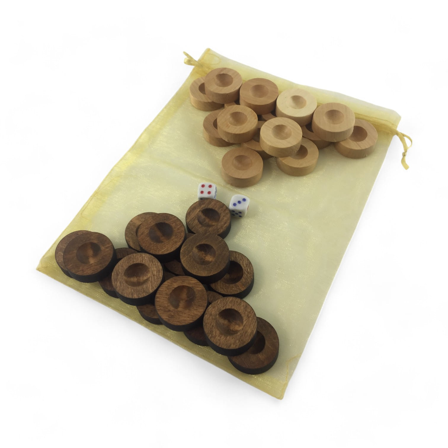 Фишки для нард с мешочком (д-28мм,выс-10мм) кубики в комплекте,цвет натуральное дерево и коричневые.