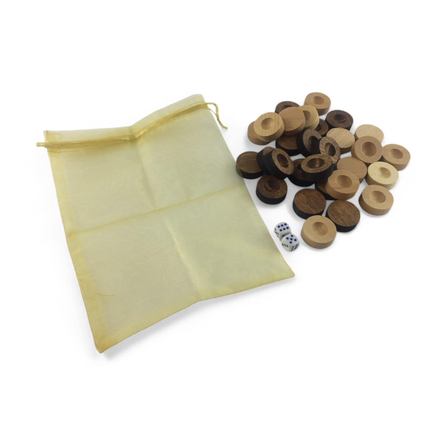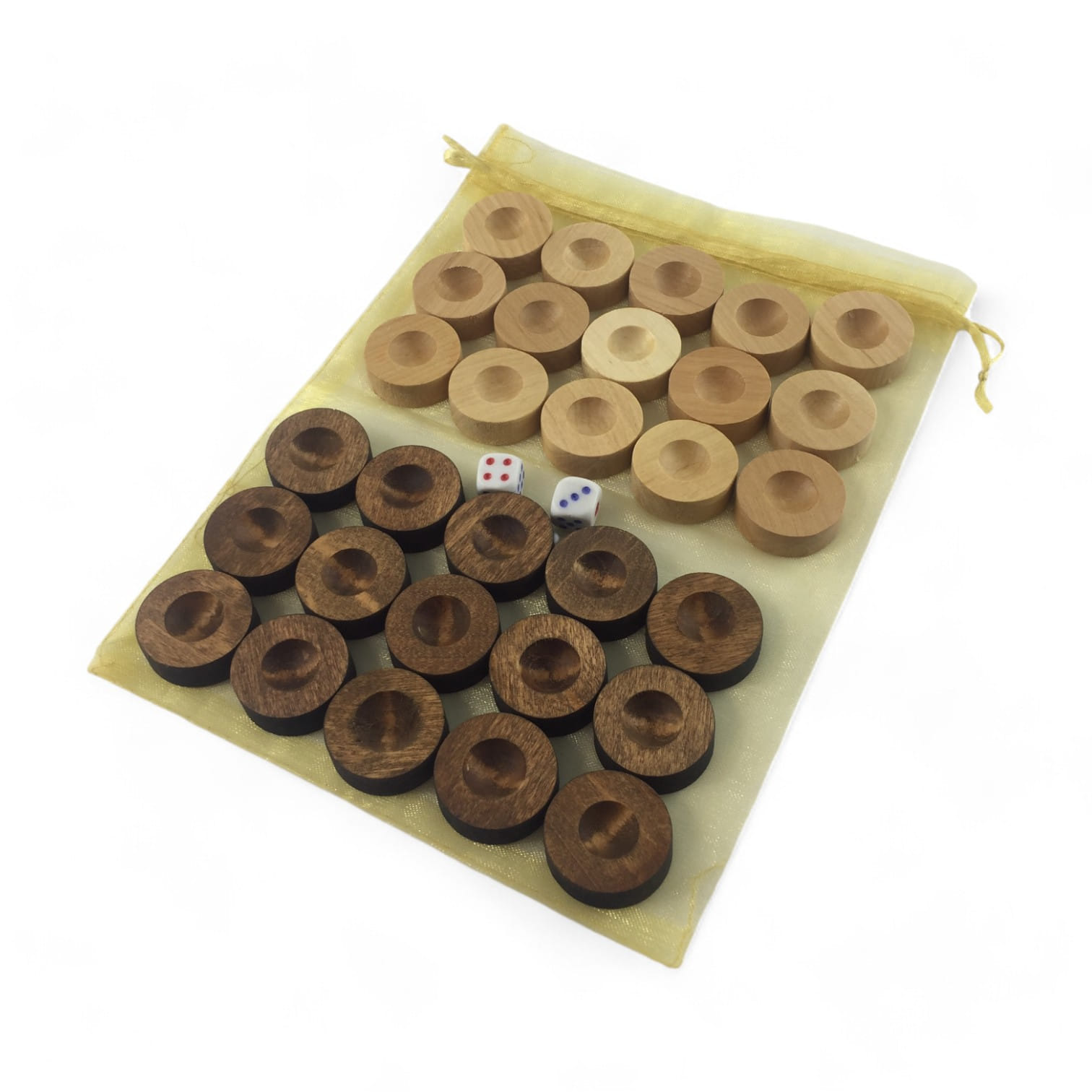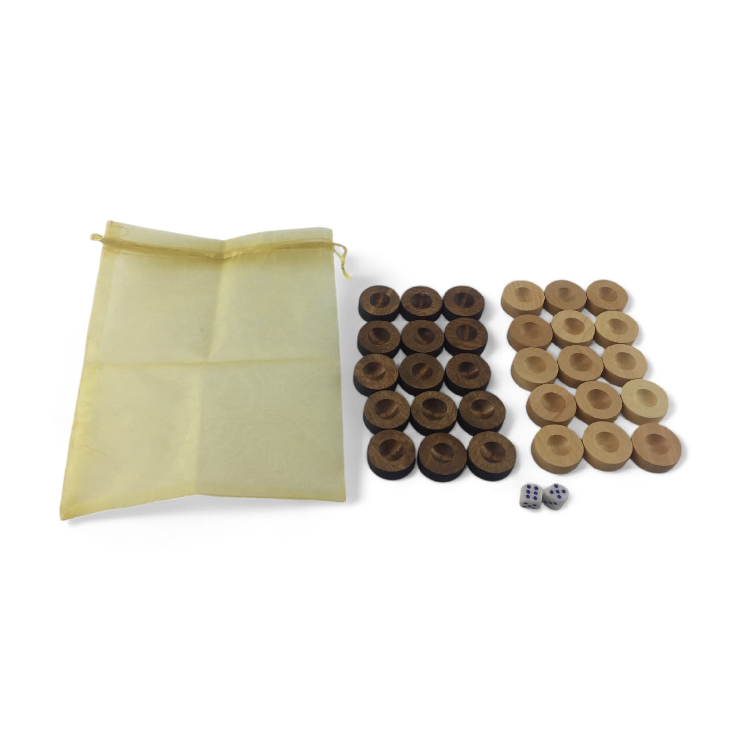 Фишки для нард с мешочком (д-28мм,выс-10мм) кубики в комплекте,цвет натуральное дерево и коричневые.