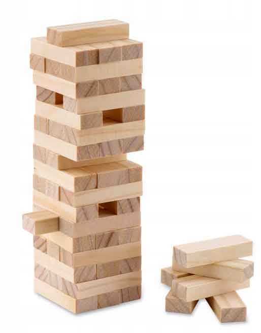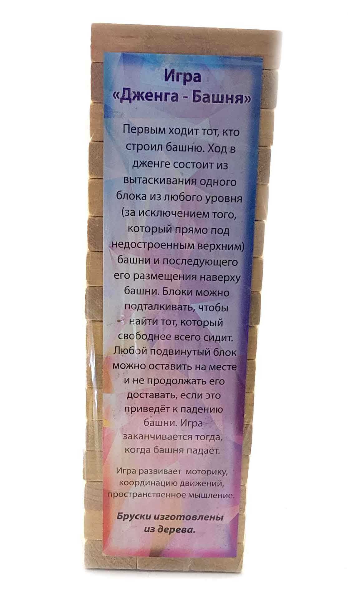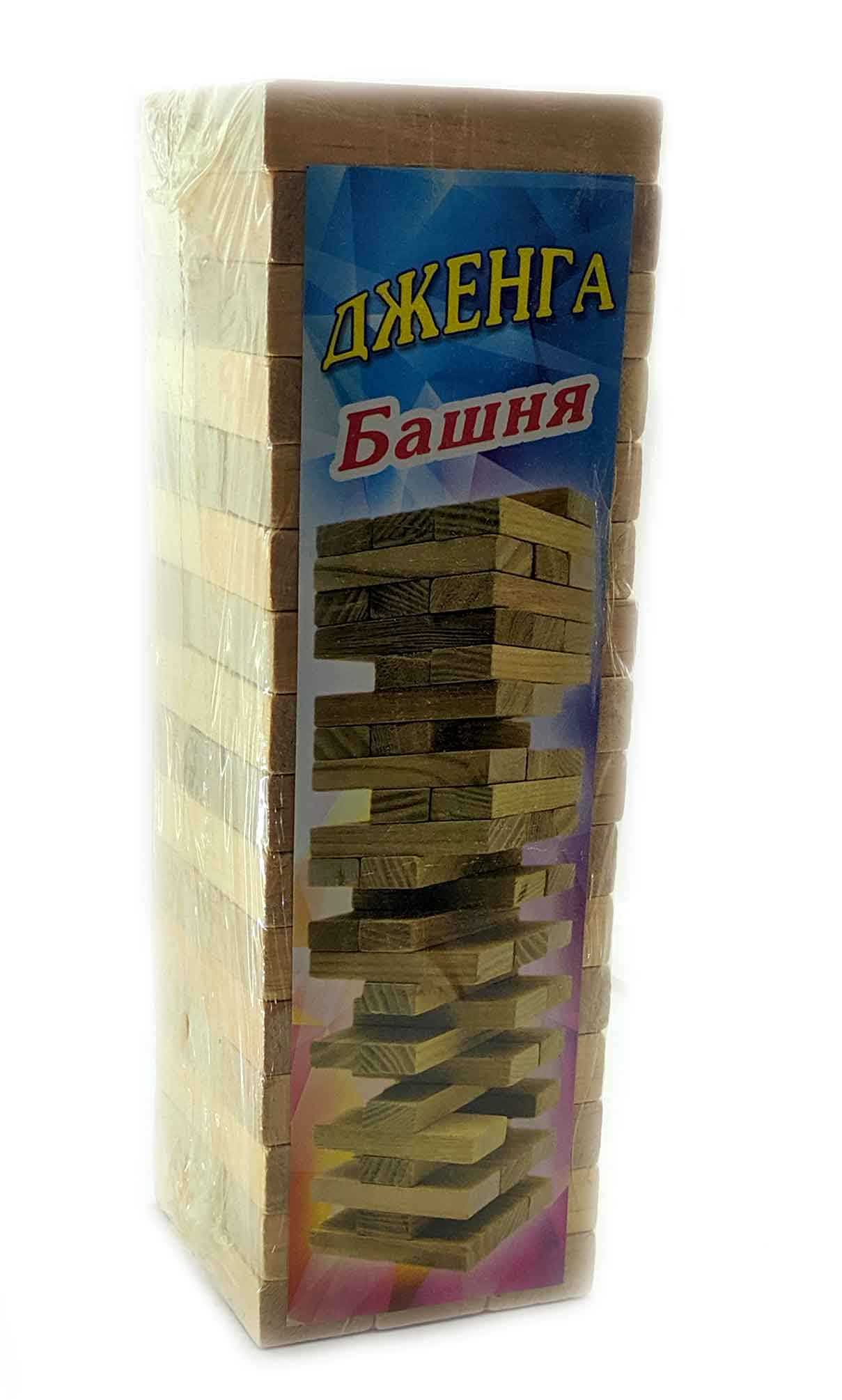 Дженга сделана из массива дерева.Дженга – это башня из деревянных брусков, которая растёт вверх, падает и снова растёт! Дженга – игра на ловкость рук, смекалку и чувство равновесия. В настольной игре Дженга (Jenga) Вам предстоит выстраивать башню из деревянных брусков, вынимая бруски с нижних «этажей» и докладывая их наверх.