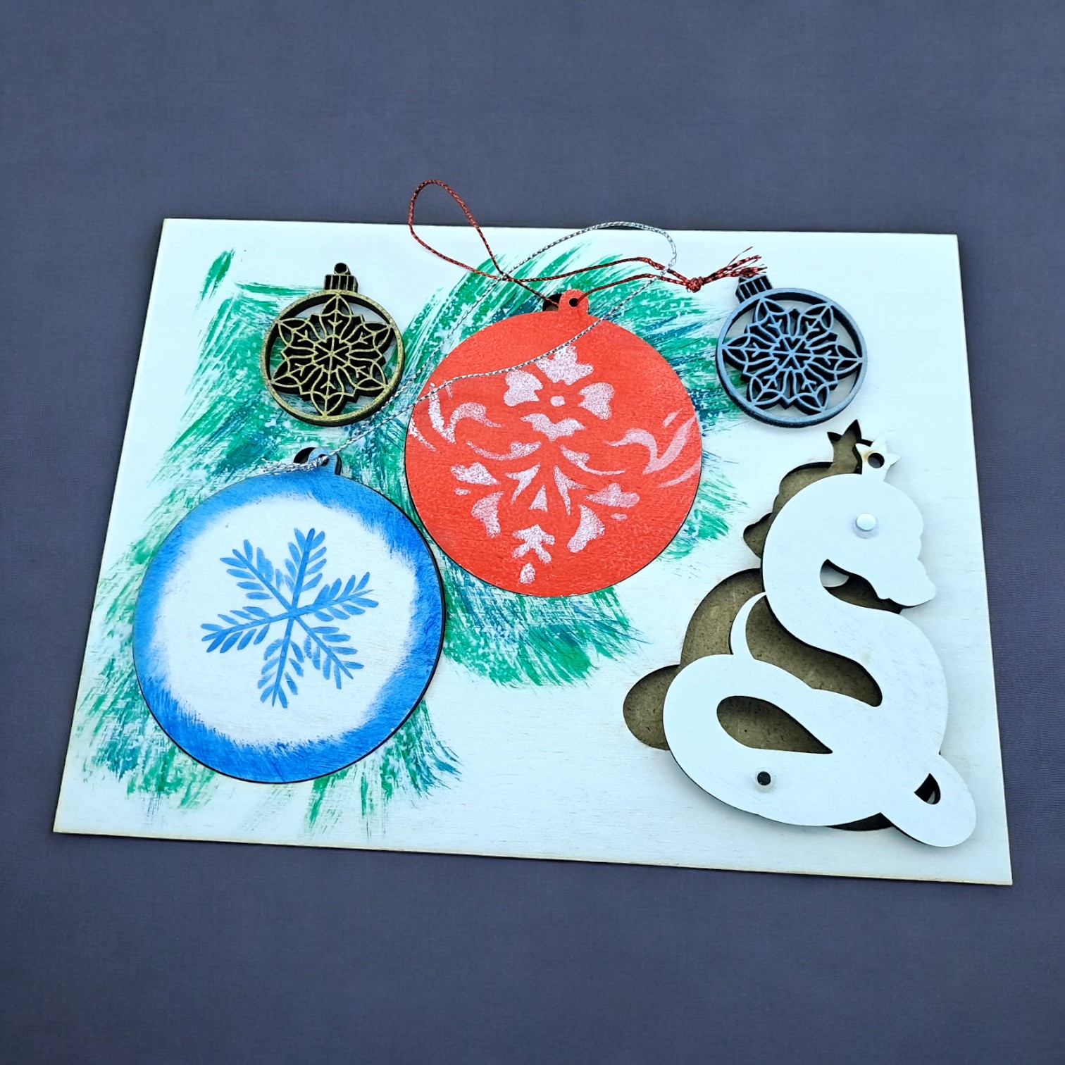 Крафтовая новогодняя открытка Змея сказочная(200*150*8мм).Комплект магнит ,4 подвески на планшете
