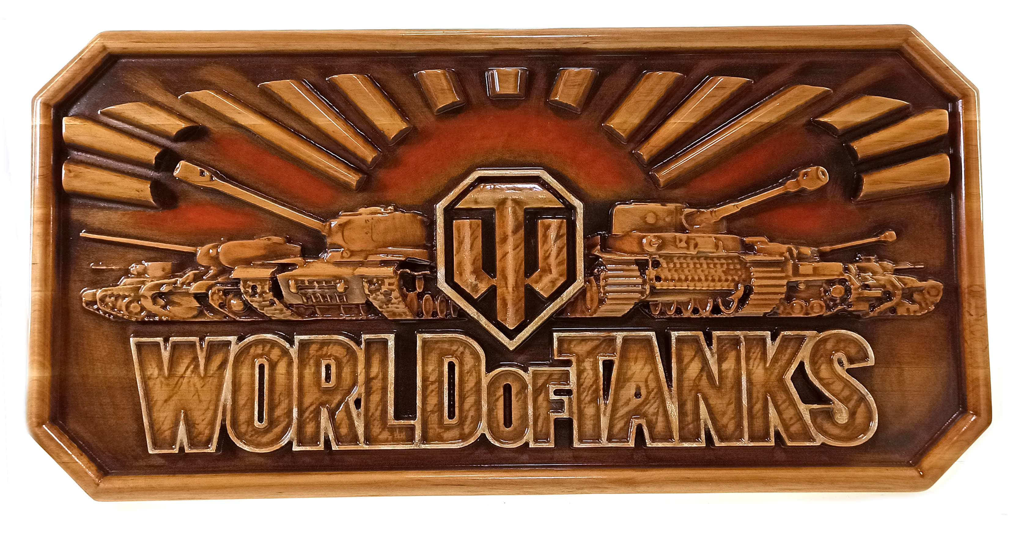 Панно World of tanks, резное,(51,5х25х2,4 см) массив дерева,покрыто патиной ,эмалями и лаком.