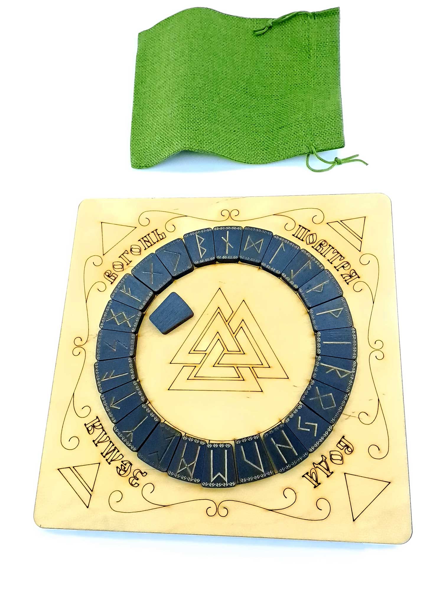 Рунический комплект : темные руны с светлым руническим алтарем на украинсом языке и мешочком