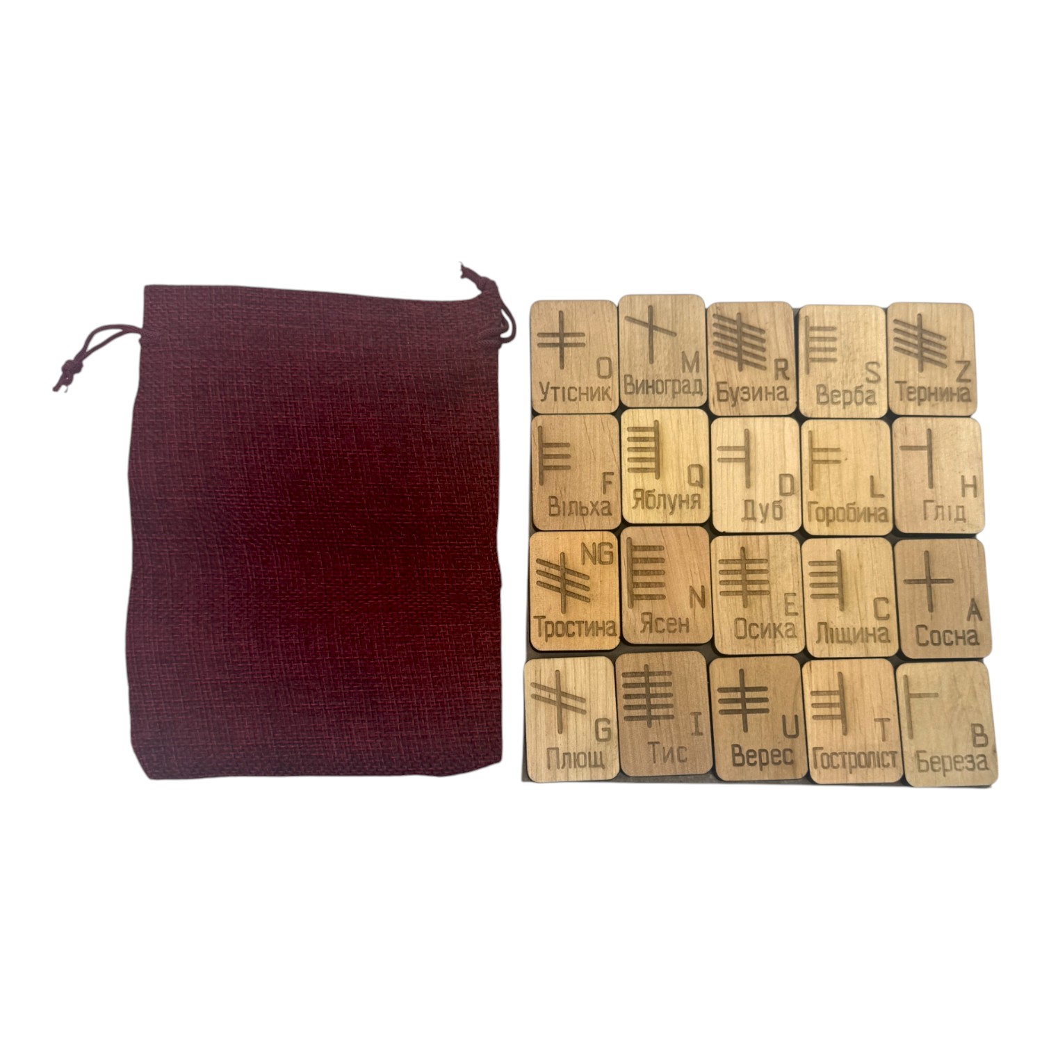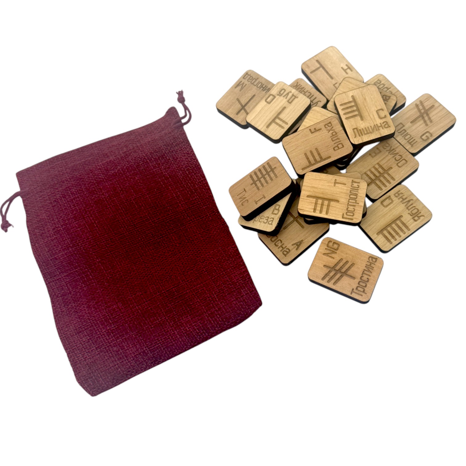 в комплекте описание рун с изображением ,мешочек для гадания и 20 рун из массива дерева.