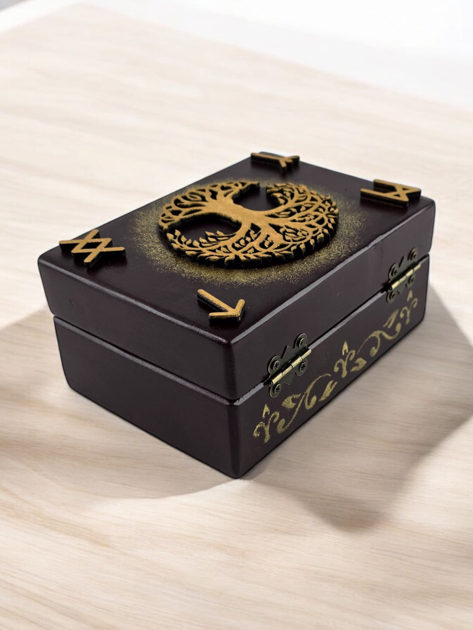 Обрамите свои руны в эстетичной шкатулке, которая не только сохранит их величие, но и станет красивым украшением вашего пространства. Наша деревянная шкатулка, выполненная в коричневом цвете с уникальным изображением дерева жизни, создает особое место для ваших рун.