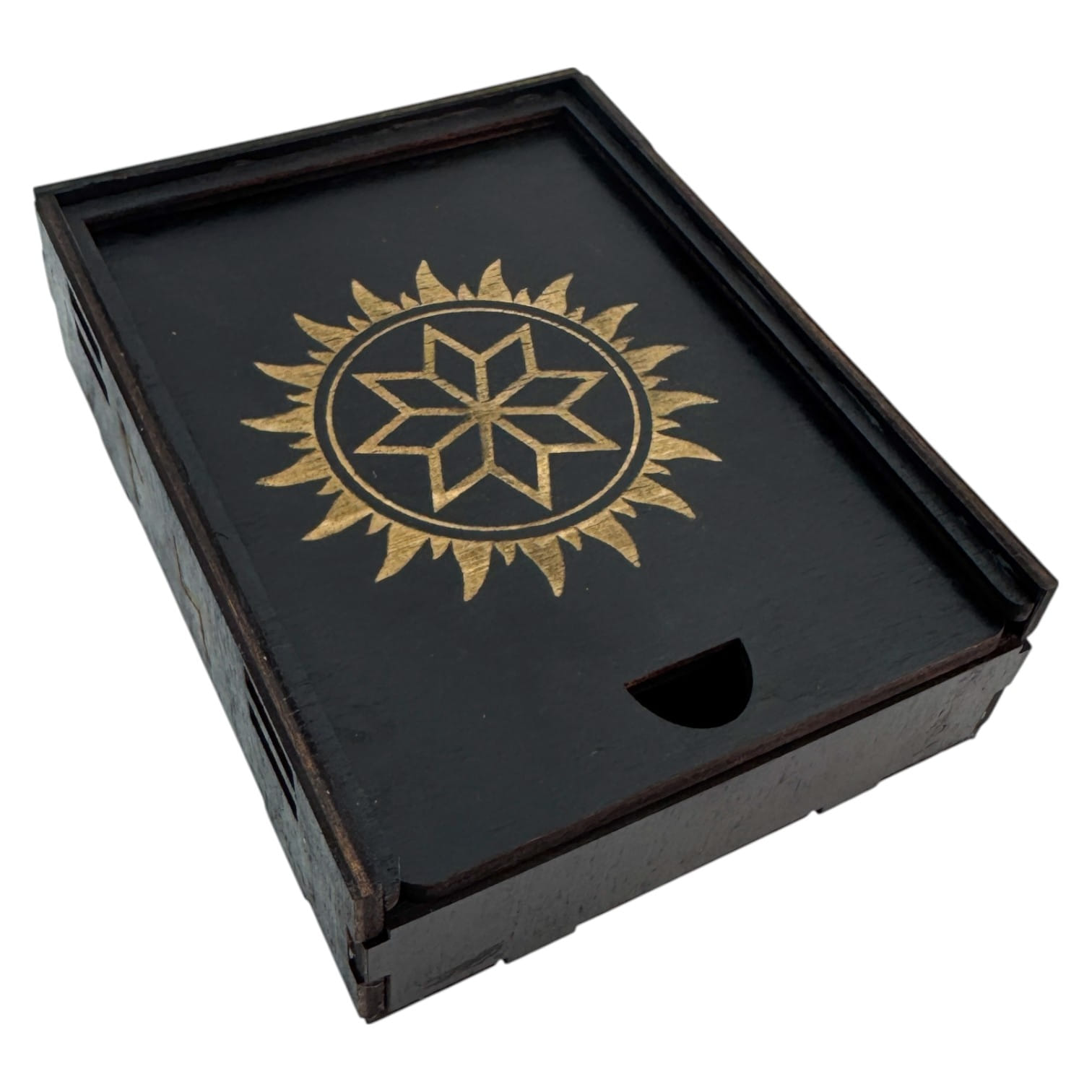 Шкатулка для рун и оберегов Алатырь (14х10.5х4см), деревянная покрыта темной эмалью.