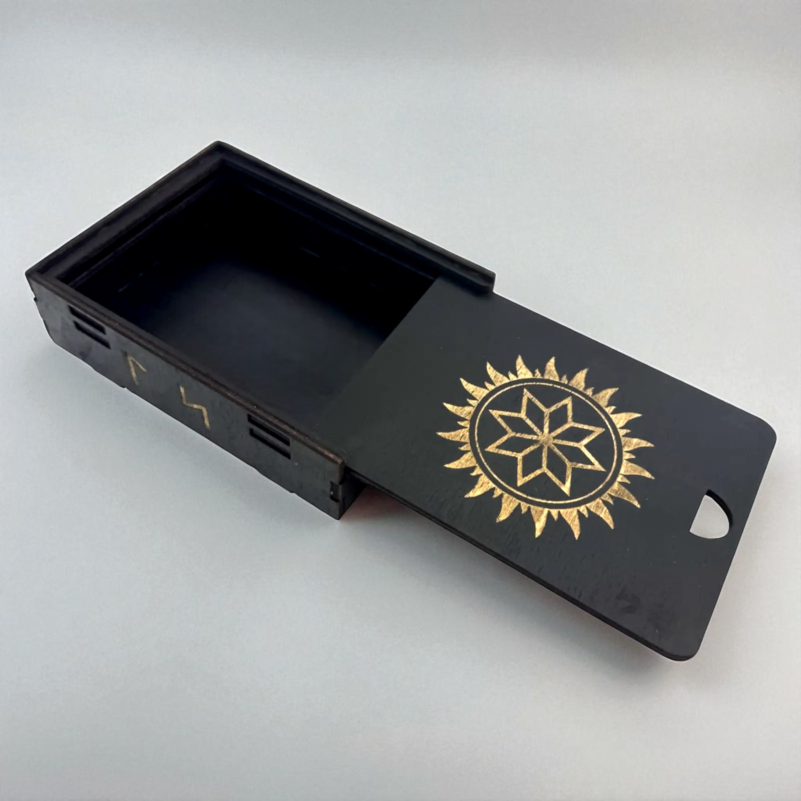 Эта уникальная шкатулка предназначена для хранения славянских рун, оберегов, амулетов и магических артефактов. Выполненная из натурального дерева и покрытая чёрной эмалью, она сочетает в себе древнюю силу, стиль и практичность.