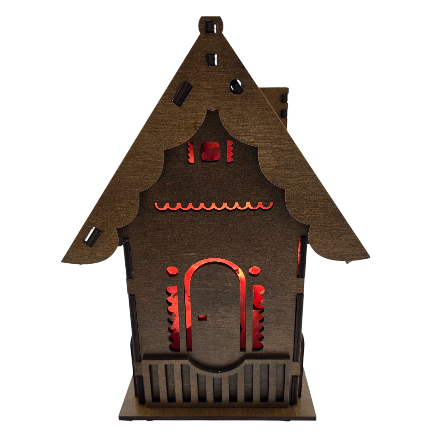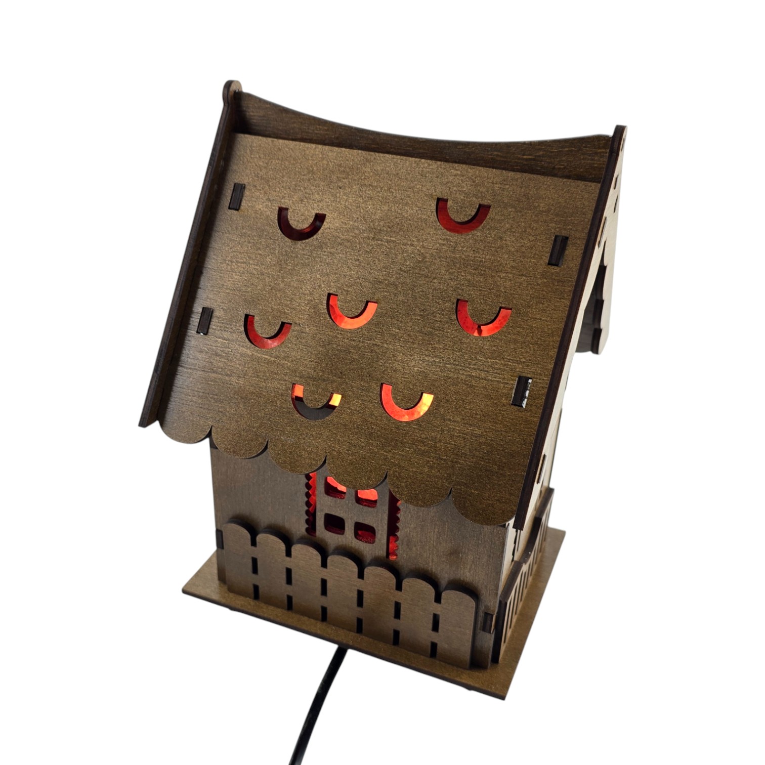Уютный светильник в форме домика, выполненный из натуральной фанеры и украшенный декоративной подсветкой.