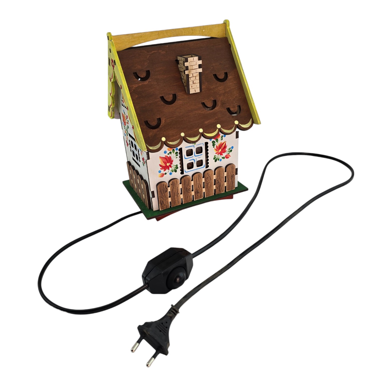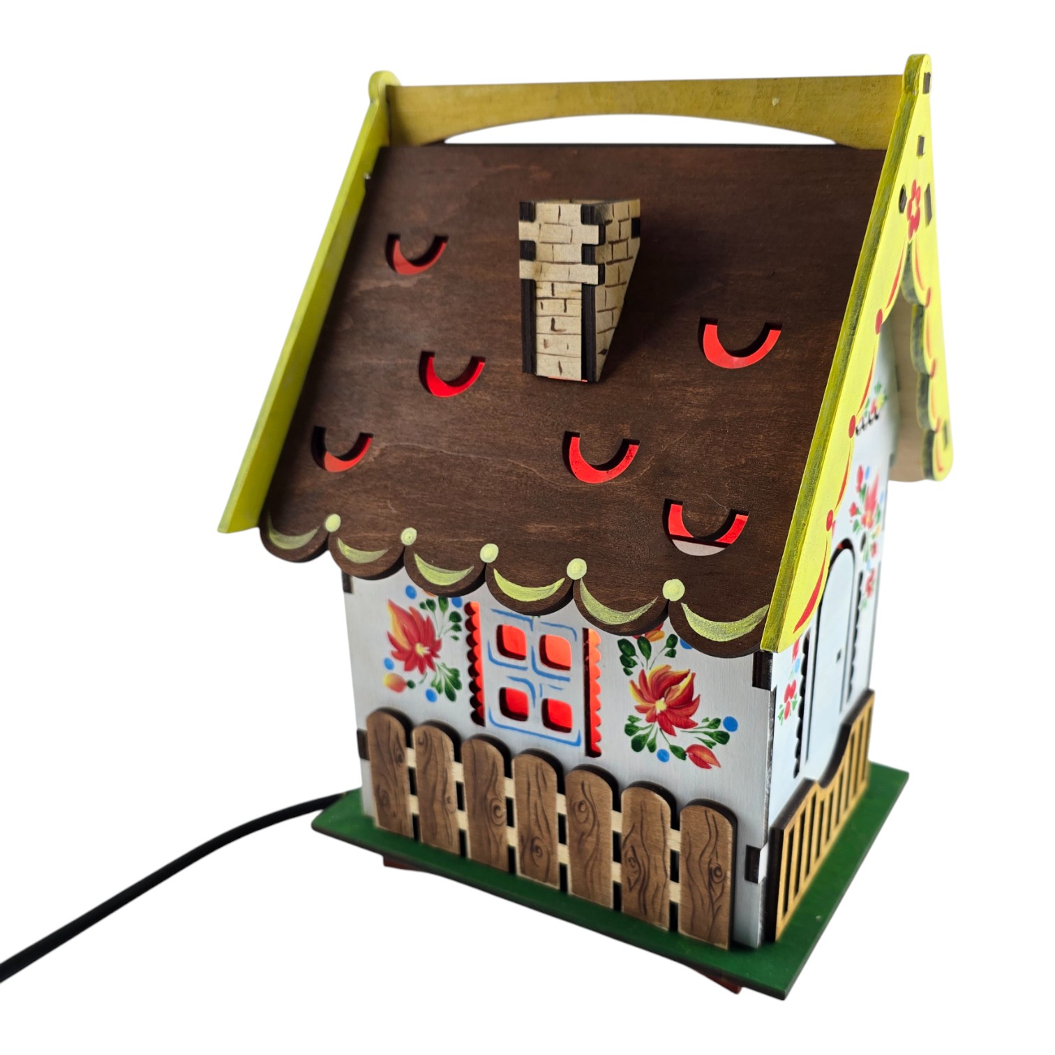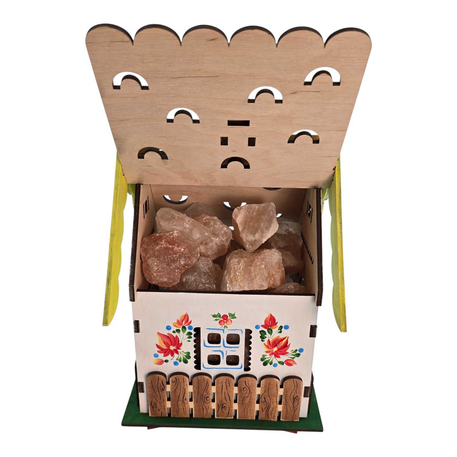 · Дизайн "Домик": Светильник выполнен в виде уютного домика из натурального дерева. Деревянный корпус украшен ажурной резьбой и яркой ручной росписью в народном стиле (цветочные мотивы, заборчик), что придает ему теплоту и сказочный вид. Открывающаяся крыша позволяет любоваться кристаллами соли.