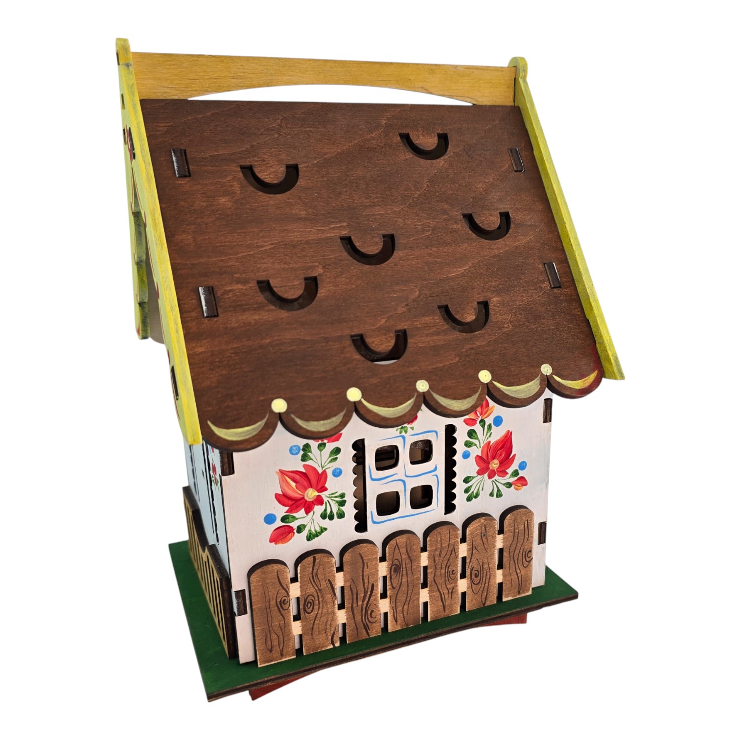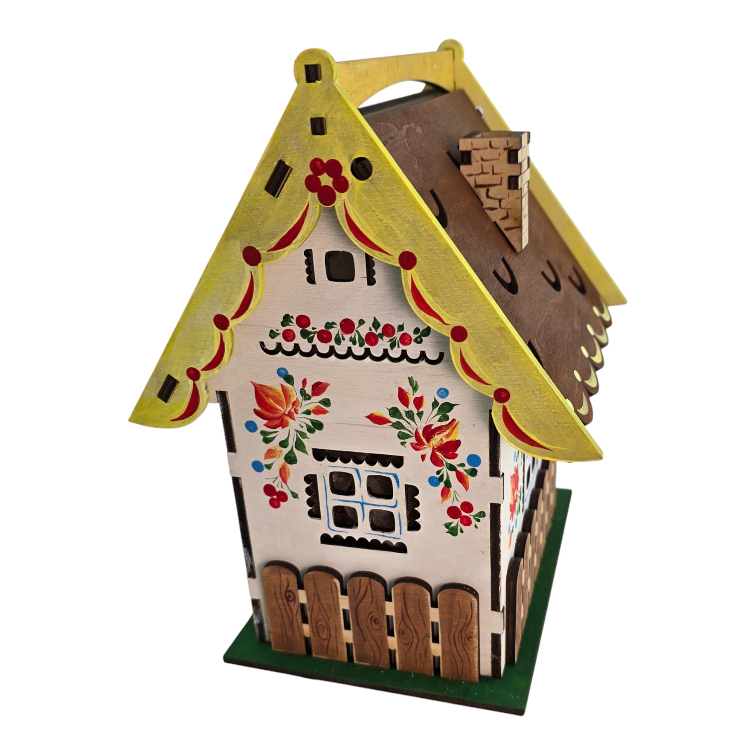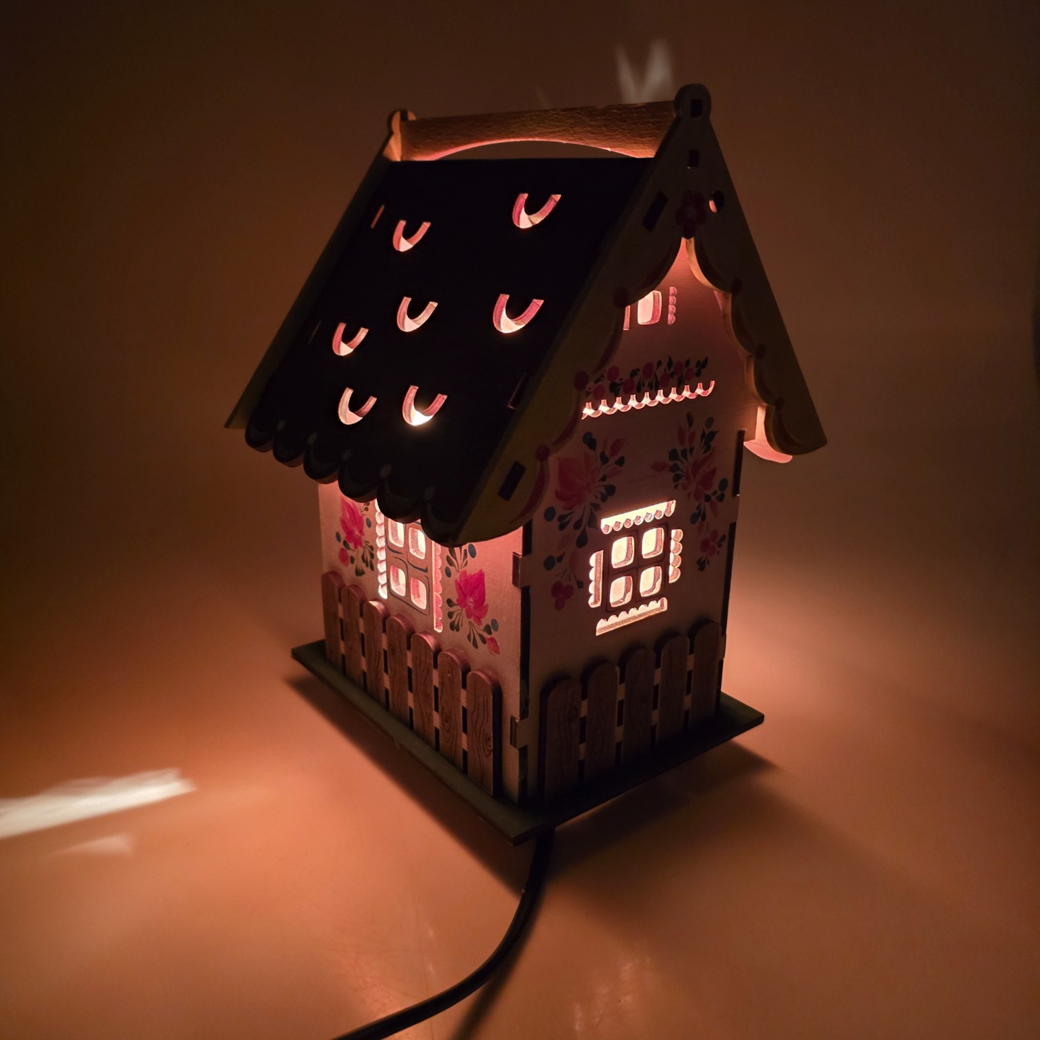 · Дизайн "Домик": Светильник выполнен в виде уютного домика из натурального дерева. Деревянный корпус украшен ажурной резьбой и яркой ручной росписью в народном стиле (цветочные мотивы, заборчик), что придает ему теплоту и сказочный вид. Открывающаяся крыша позволяет любоваться кристаллами соли.