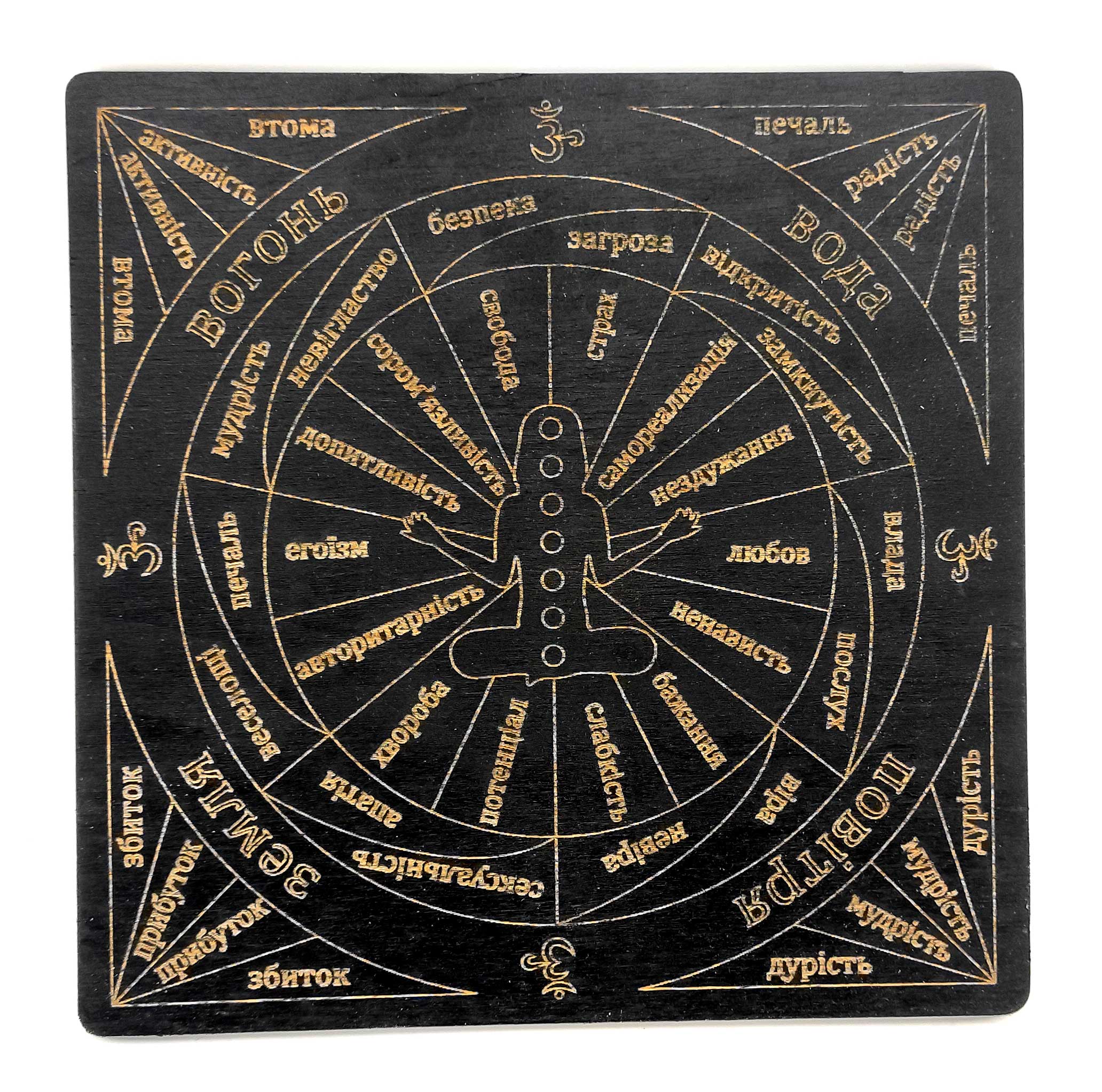 Таблица для работы с маятником Чакровая на украинском языке,темная (18х18х0,4 см)