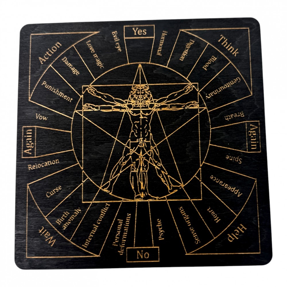 Изготовлена из прочного материала с гладкой матовой поверхностью. Размер 18×18 см и толщина 0,4 см делают её одновременно компактной и удобной в использовании. Чёткая и интуитивно понятная разметка позволяет проводить точные и эффективные сеансы работы с маятником.