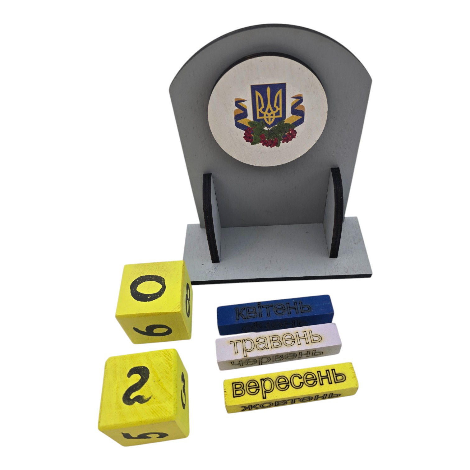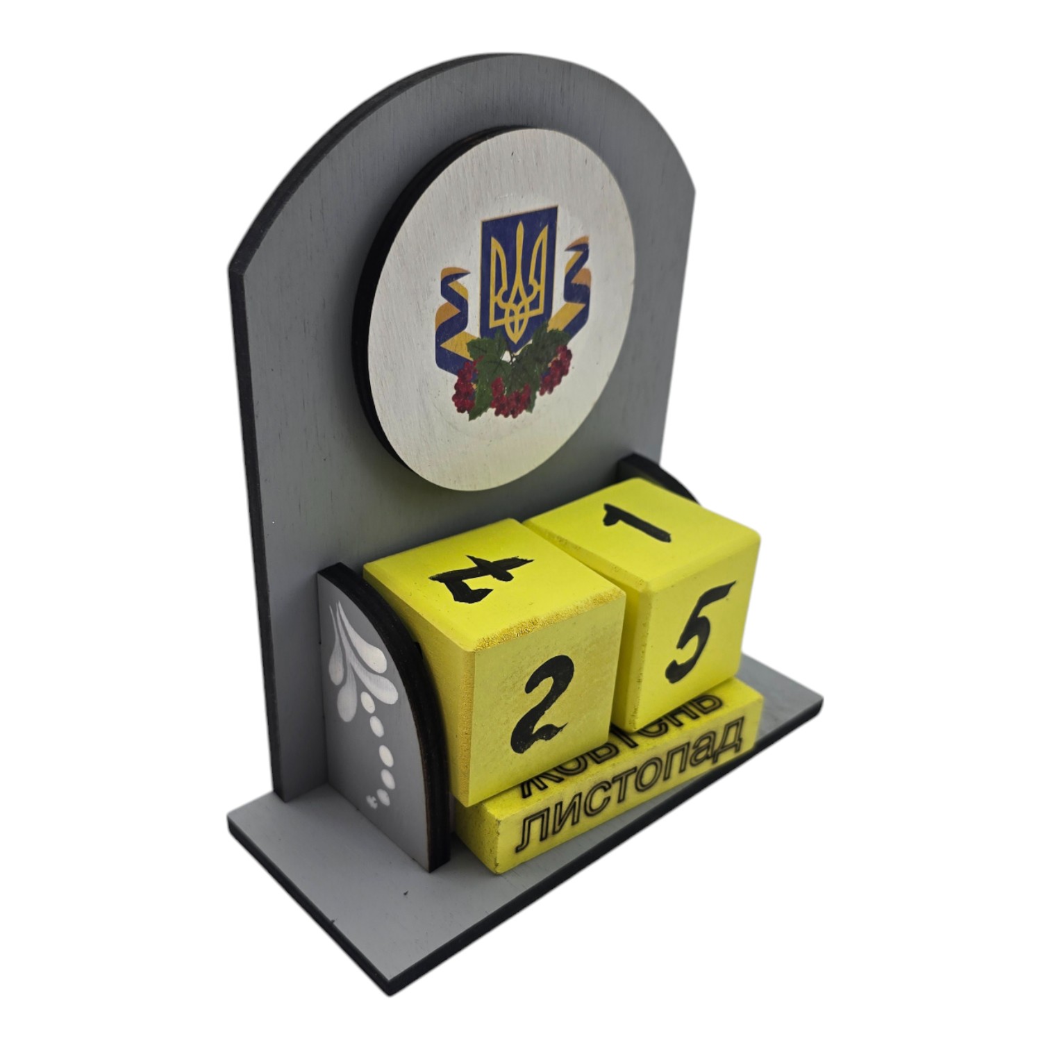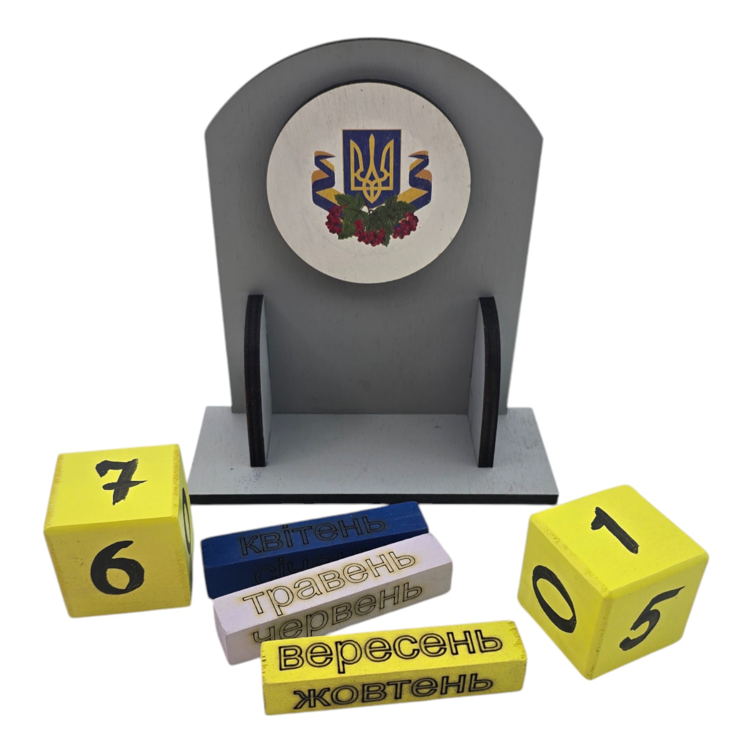 Календарь имеет размер 155х142х60 мм и состоит из кубиков различных размеров. Кубики с числами выполнены в желтом цвете и имеют размер 40х40х40 мм. Кубики с названиями месяцев выполнены в зеленом цвете и имеют размер 80х14х14 мм. Все расписано вручную и украшено символикой Украины, включая герб и калину.