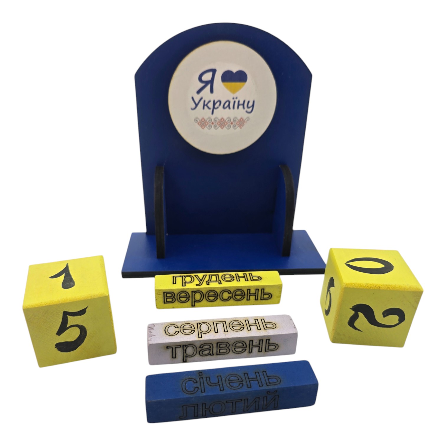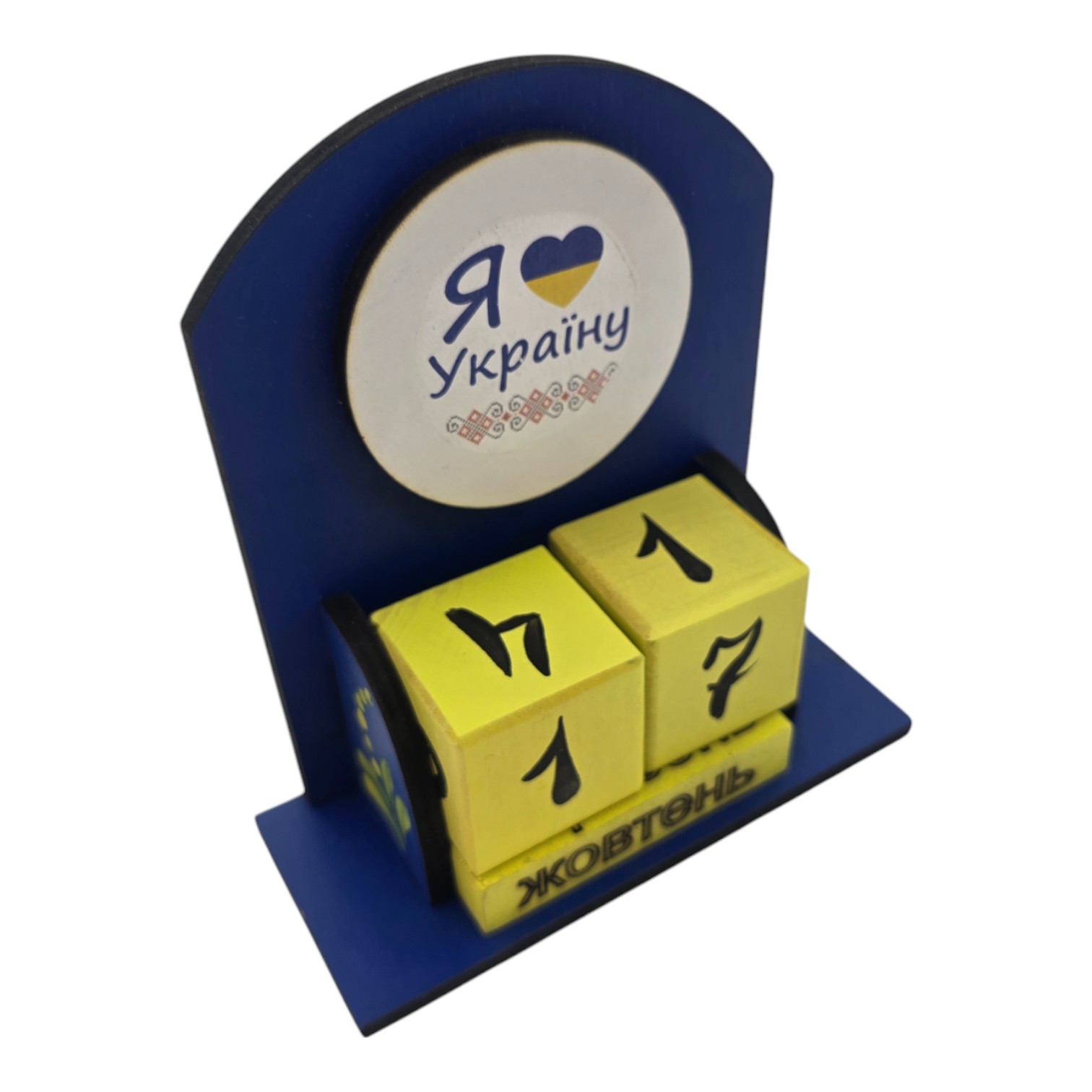 Оформление календаря выполнено в синих тонах с изображением украинского флага, где слово "люблю" разделено на две части, образующие сердечко, как символ украинской национальности. Красивая раскраска и орнамент на кубиках придают этому календарю особую эстетическую ценность.