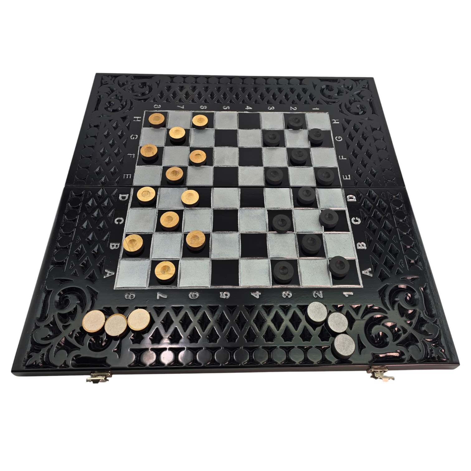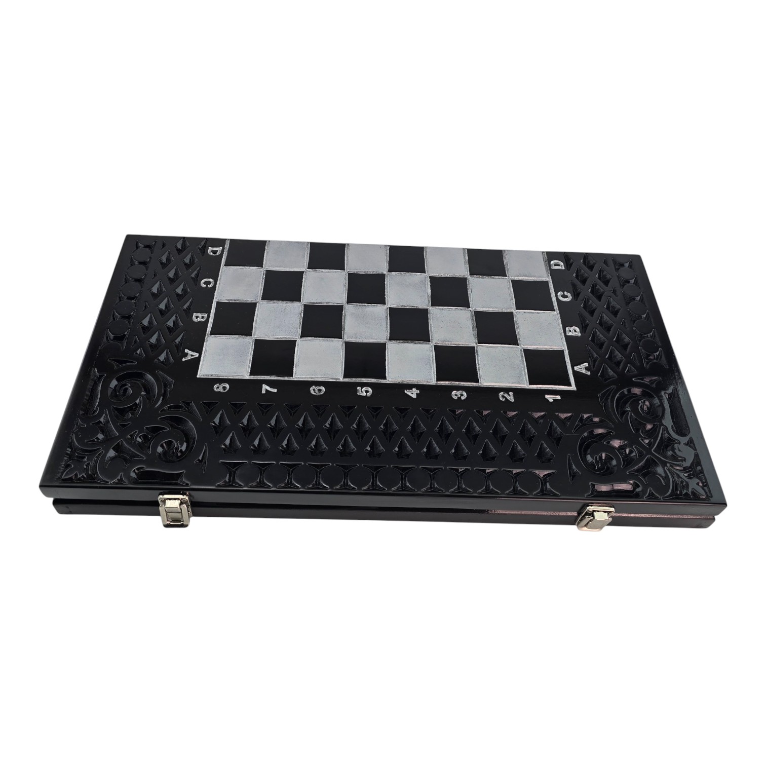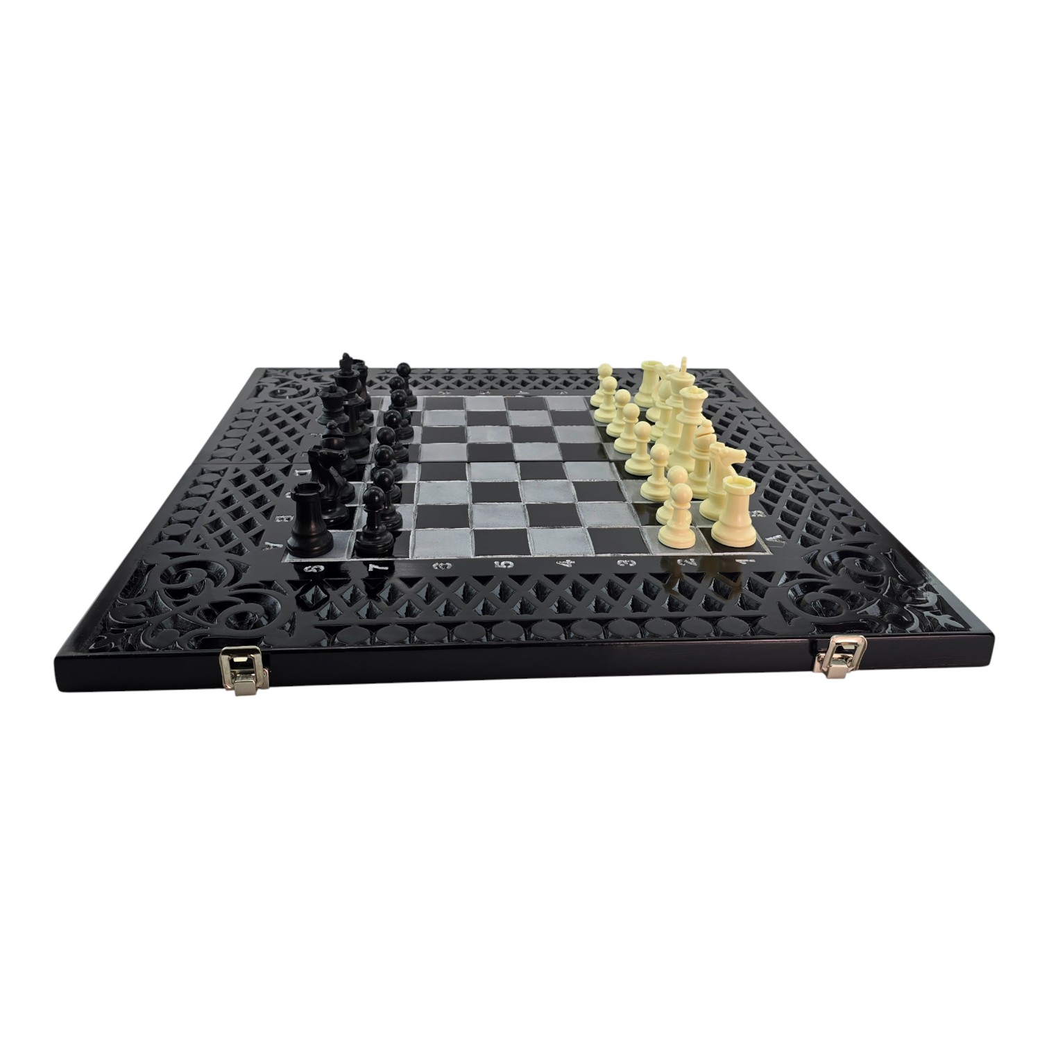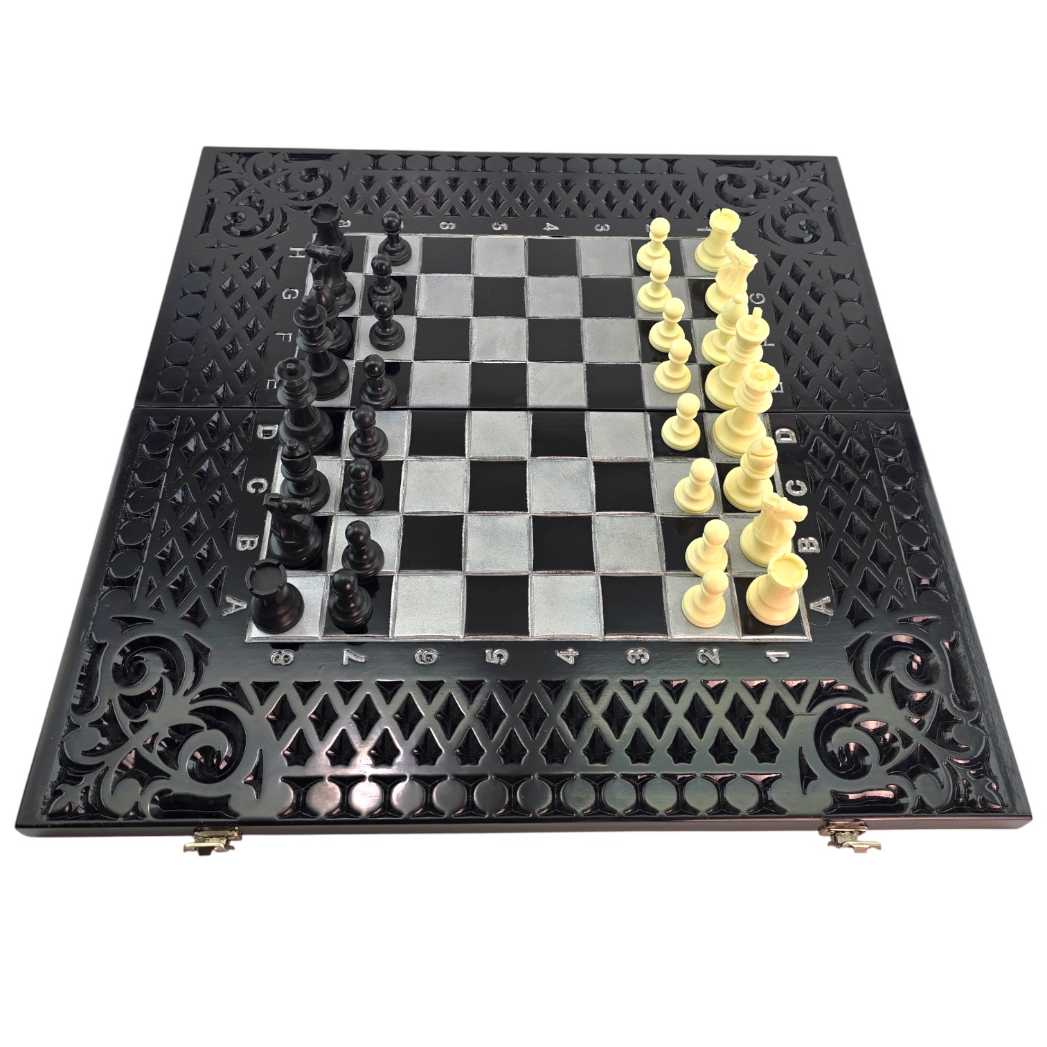Нарды-шахматы-шашки, черные (56×28×6 см),резные,деревянные,с фигурами и фишками массив дерева.