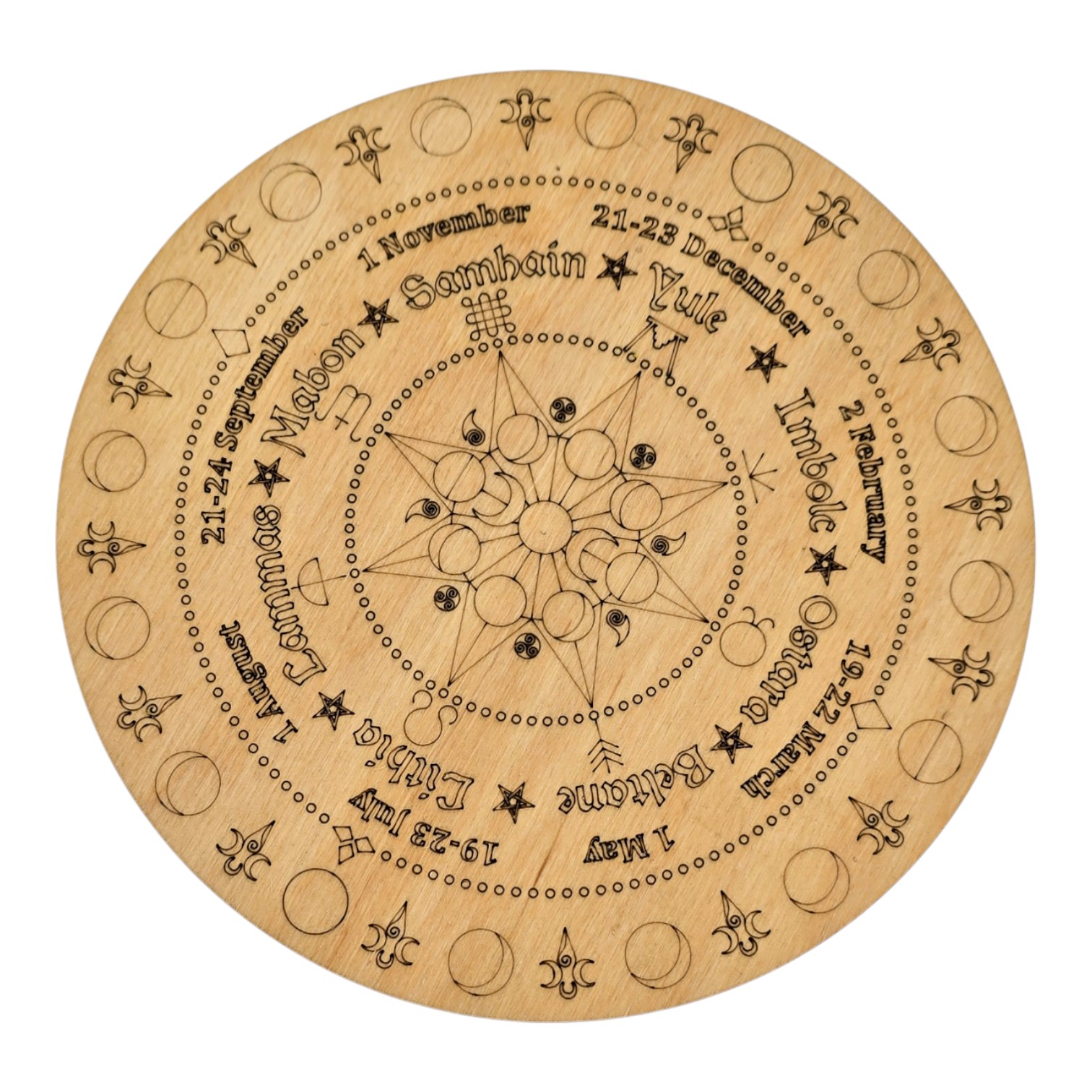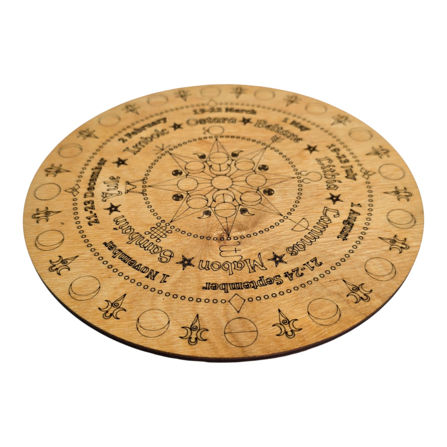 Круглая деревянная доска «Колесо Года» с детальной лазерной гравировкой, созданная для викканских практик, алтарей и медитативной работы. Изделие объединяет восемь годовых праздников (Sabbat): Yule, Imbolc, Ostara, Beltane, Litha, Lammas, Mabon и Samhain, а также лунные фазы, отражающие цикличность времени и природы.