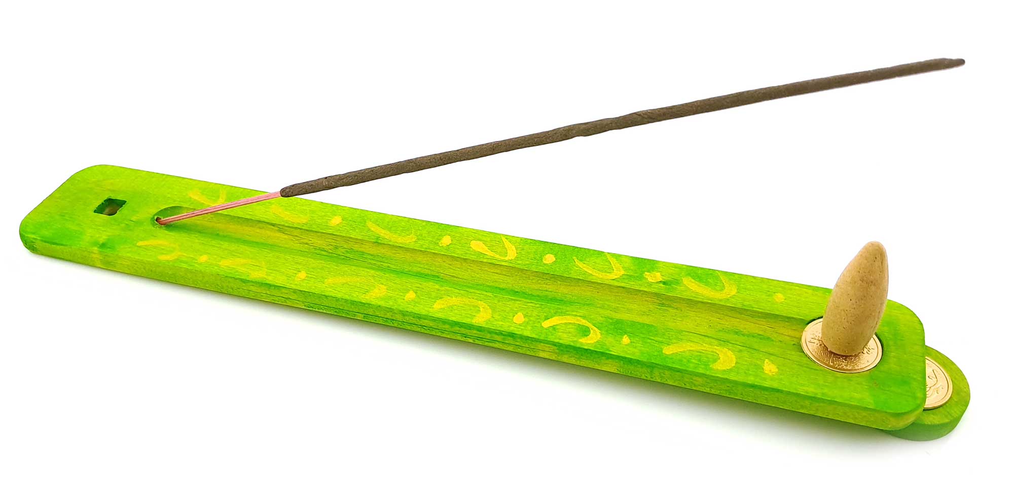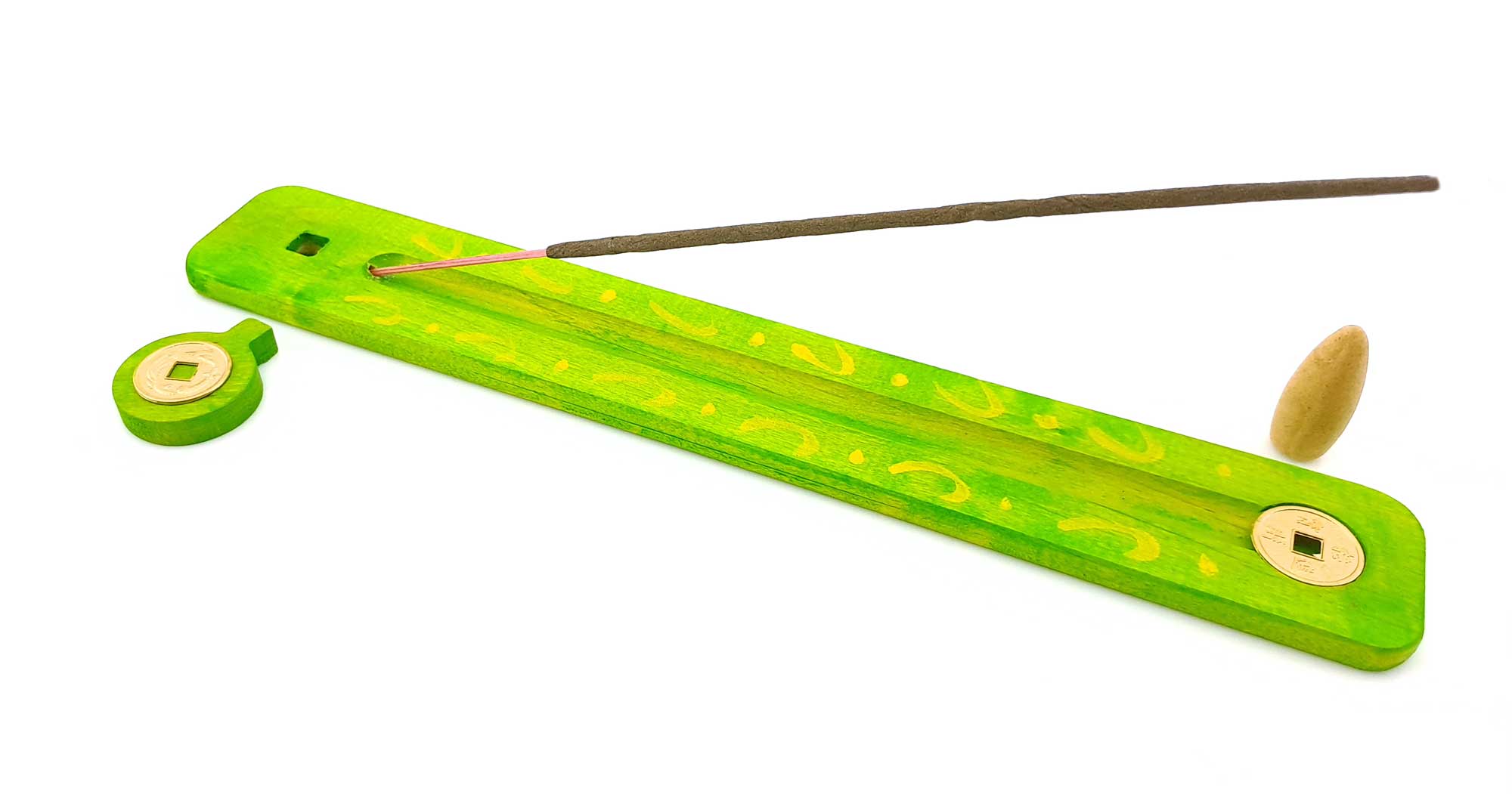 На нашей подставке также присутствует китайская монетка, на которую безосновное благовоние закрепляется. Это позволяет удобно и надежно размещать благовоние на подставке.