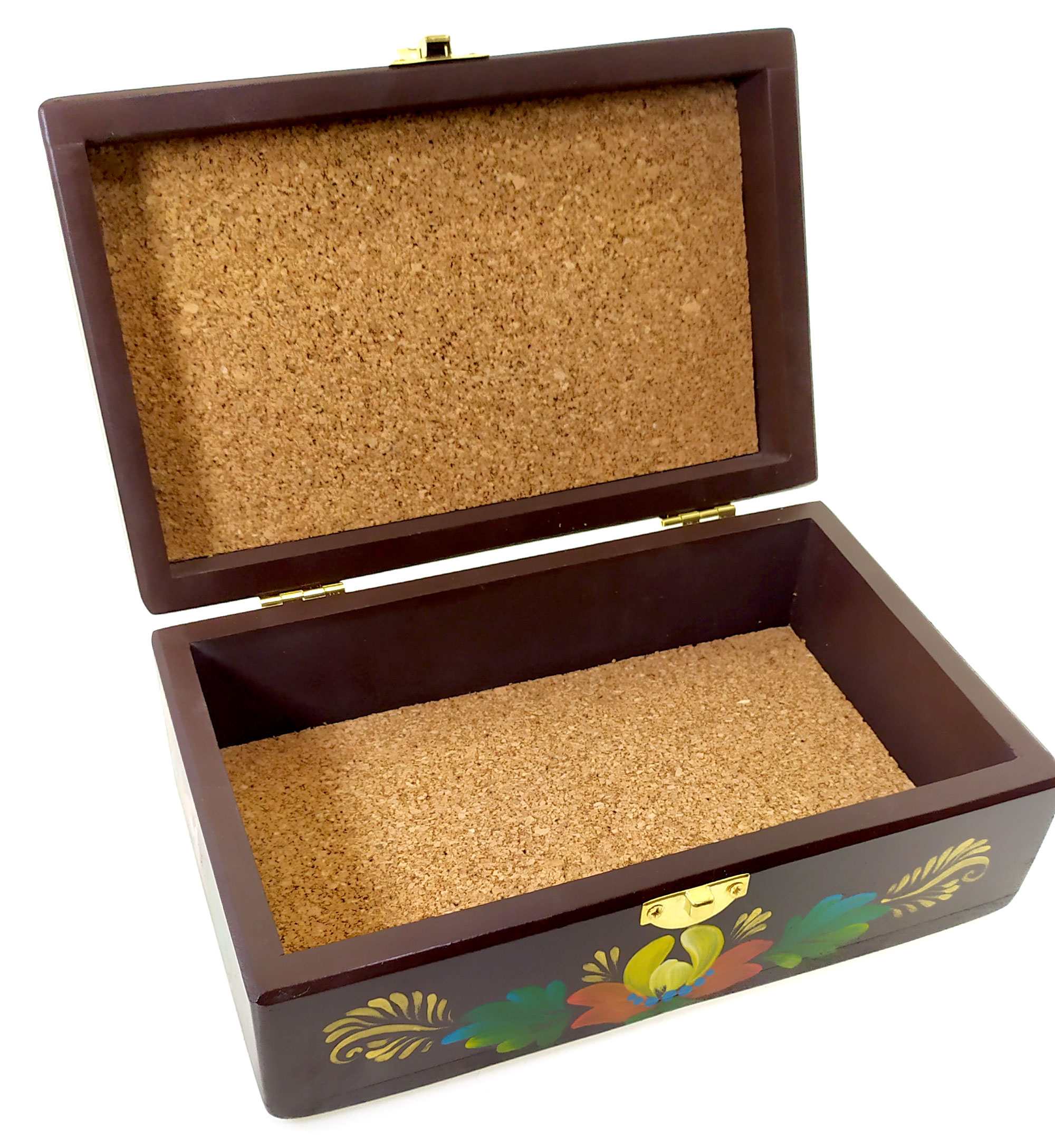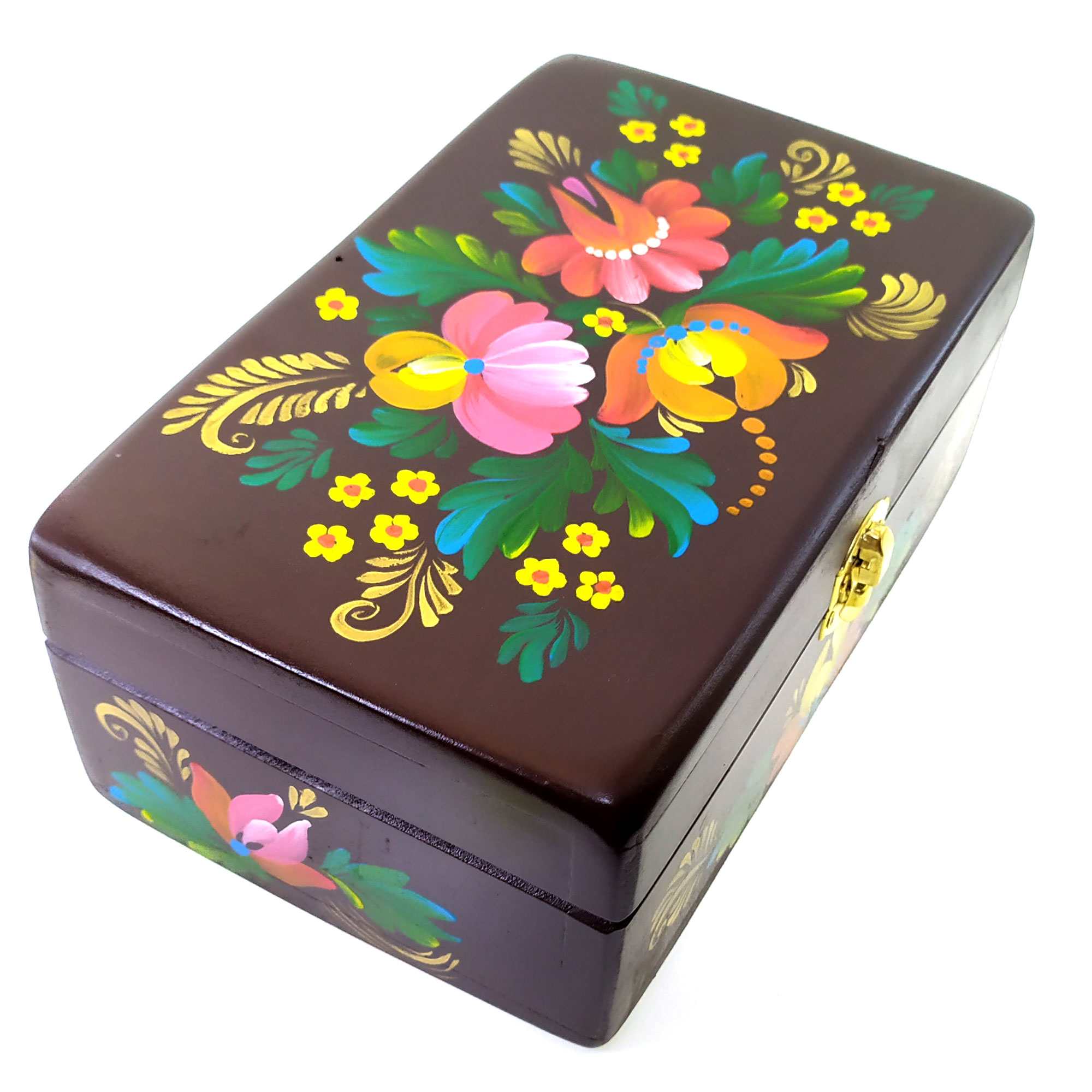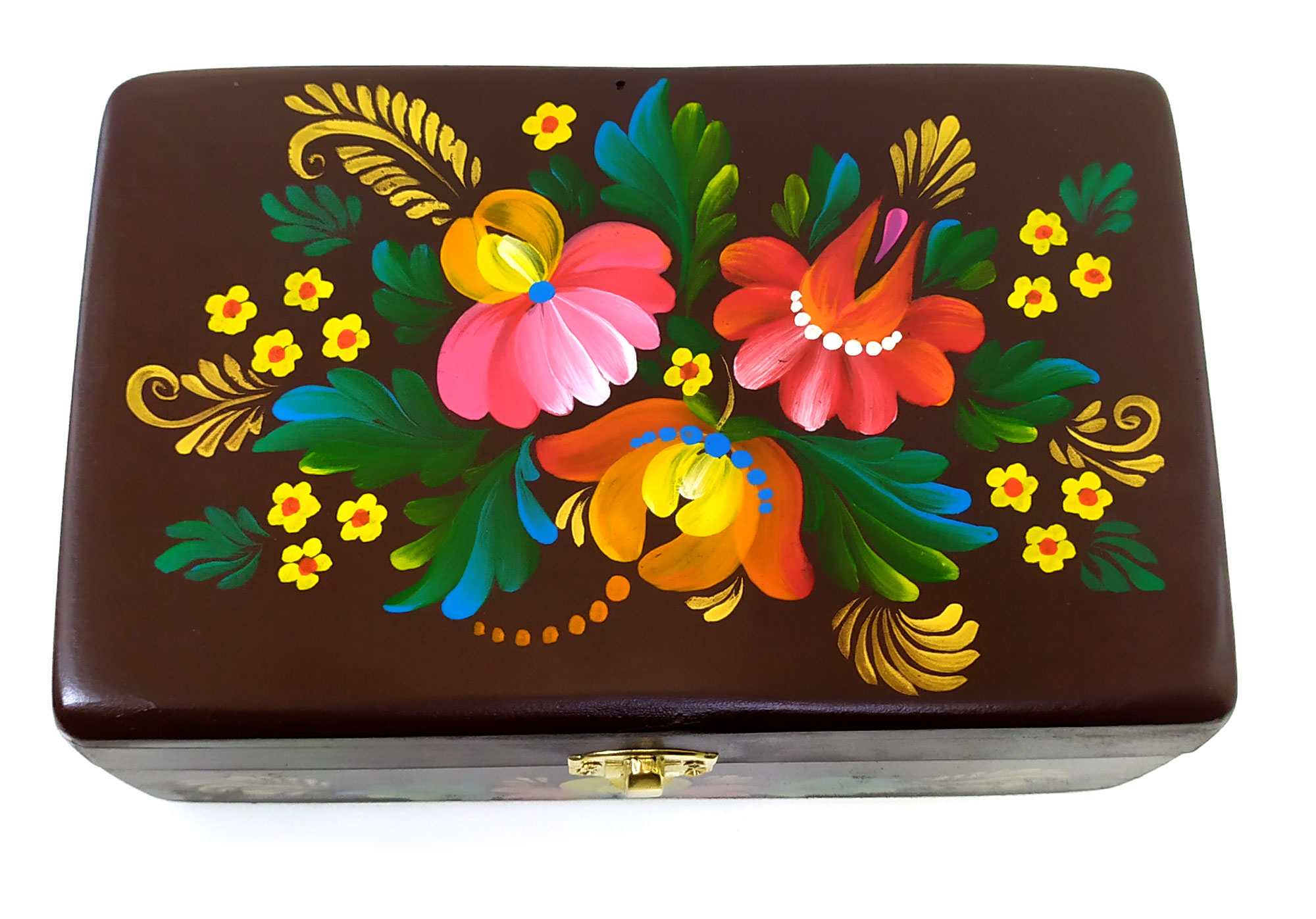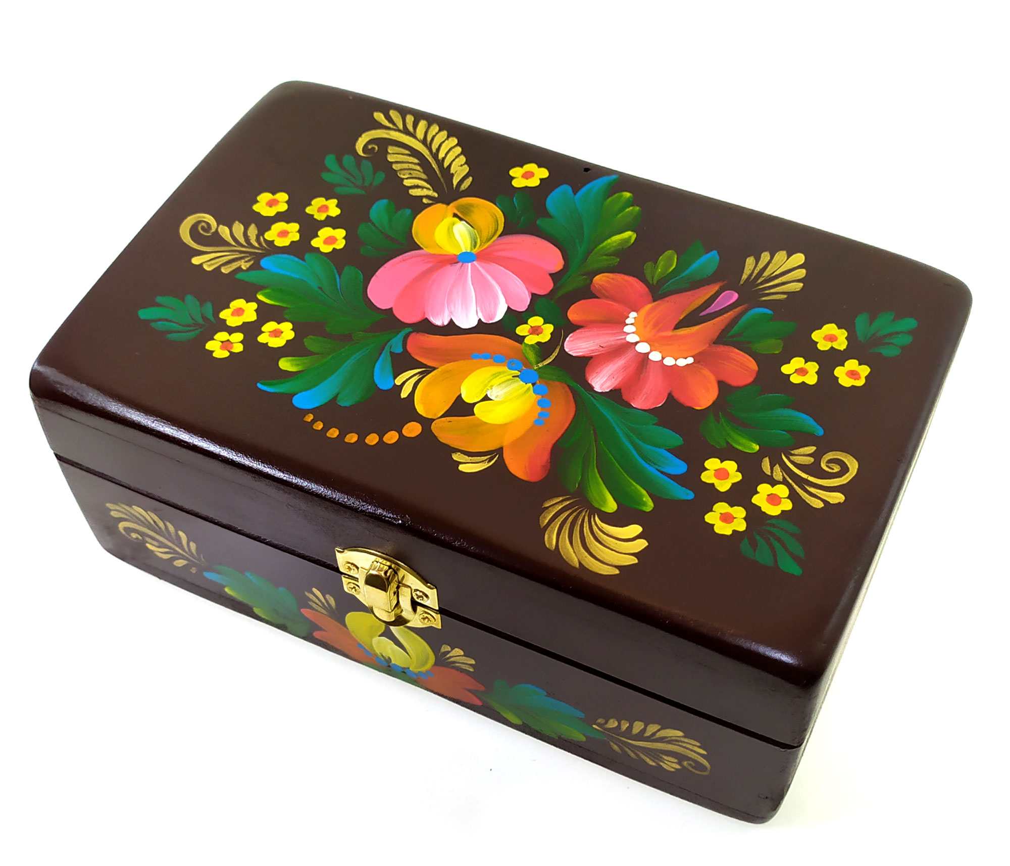 Шкатулка Коричневая с букетом из массива дерева ,ручная роспись (20,5×12,5×8 см)