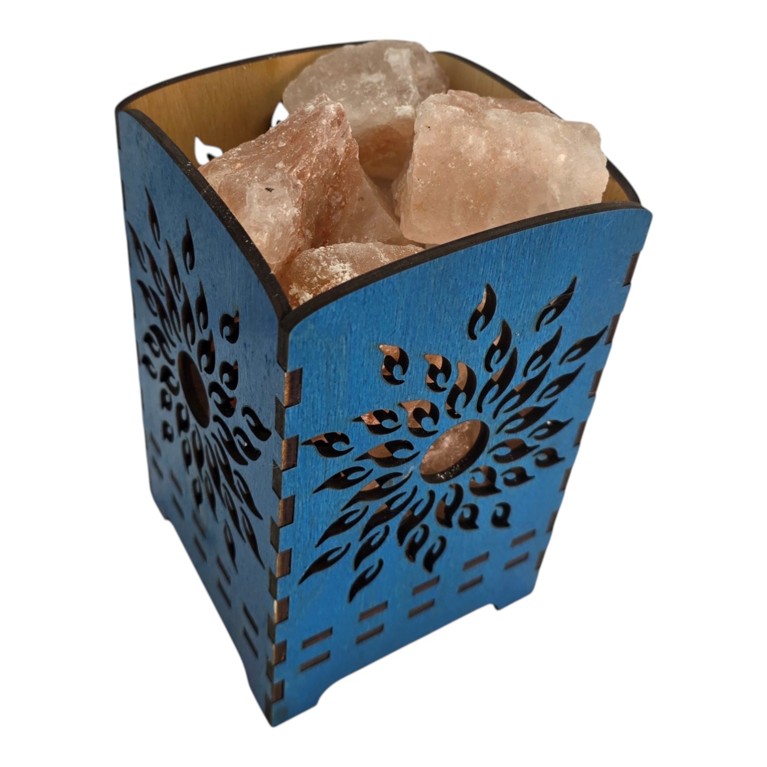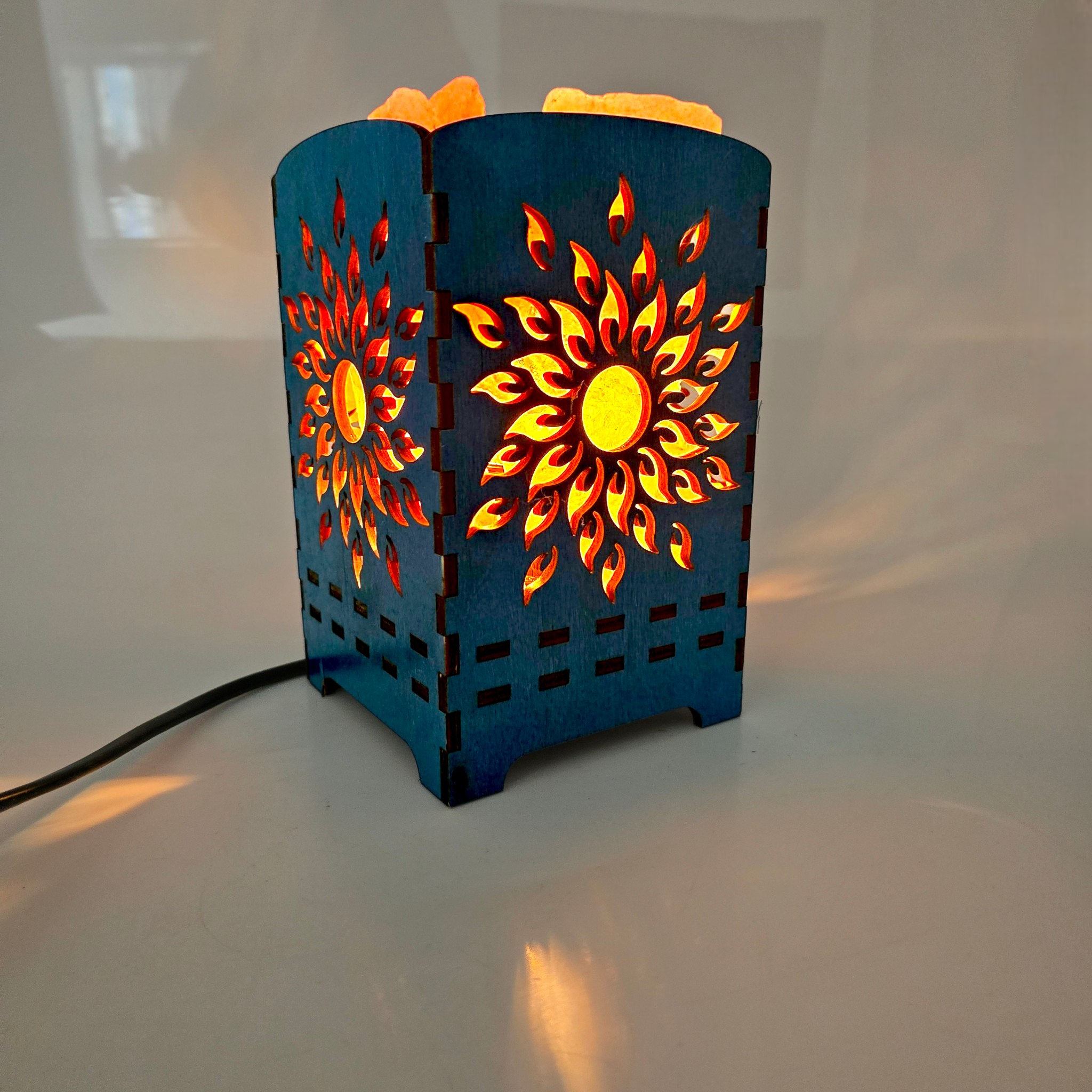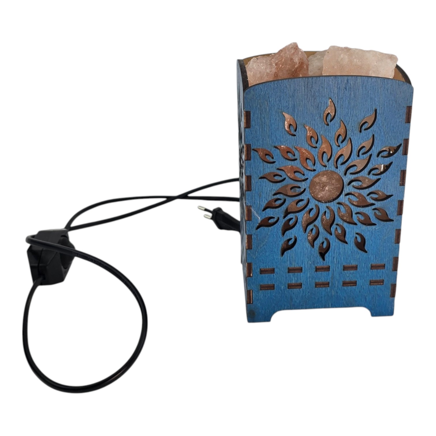 Корпус светильника выполнен из дерева с декоративной резьбой в виде солнечного узора. При включении лампы свет проходит через кристаллы гималайской соли и резной орнамент, создавая красивое сияние и мягкие световые узоры.