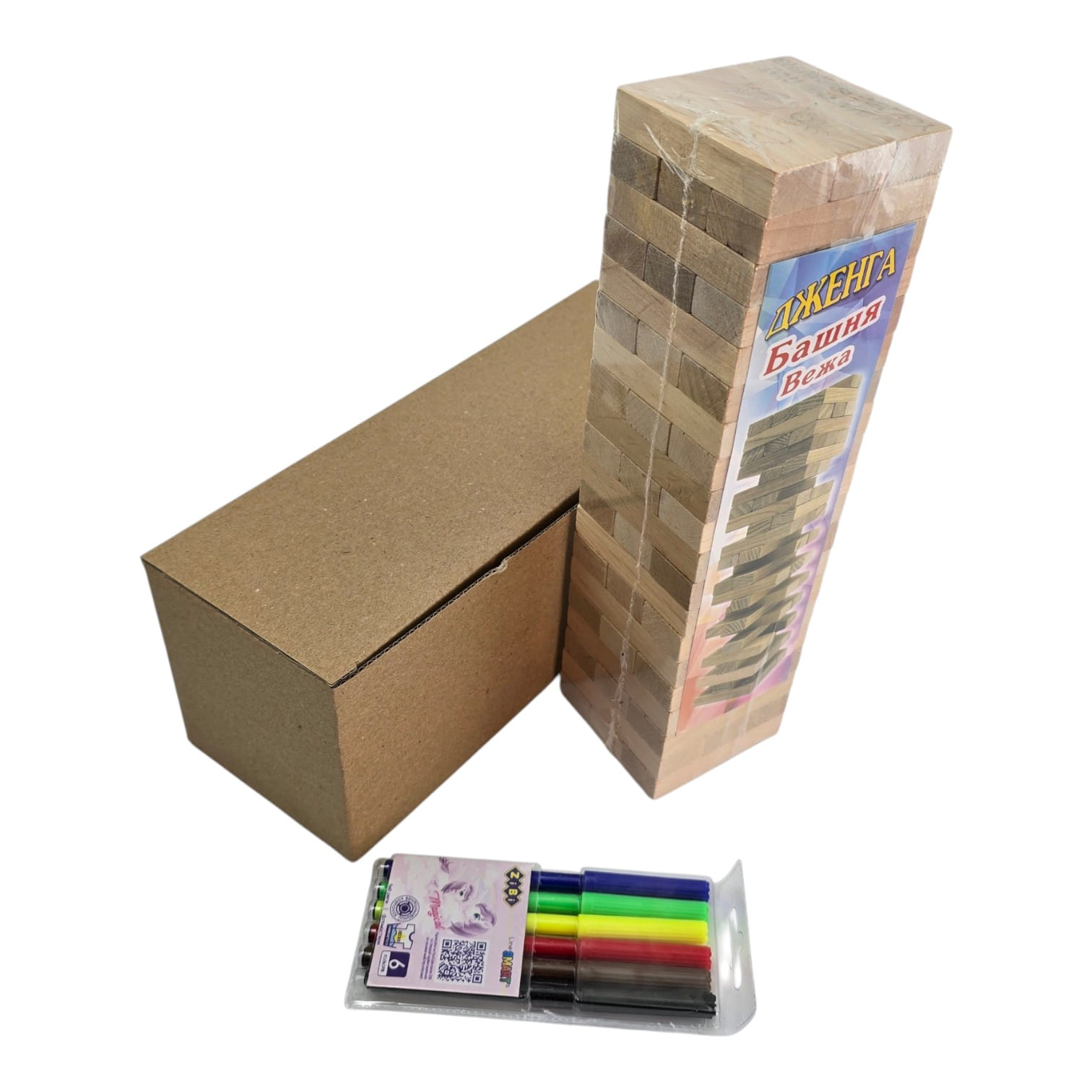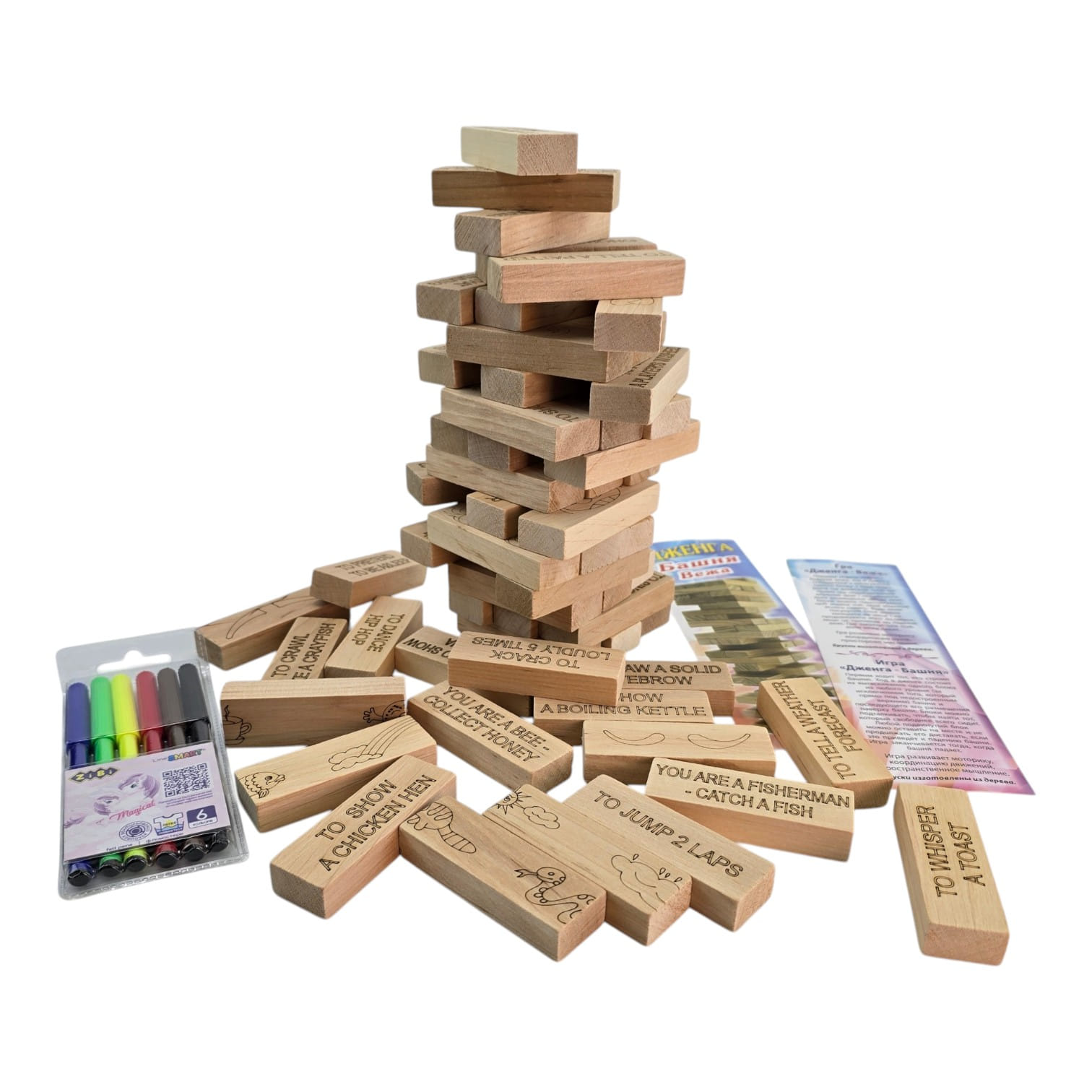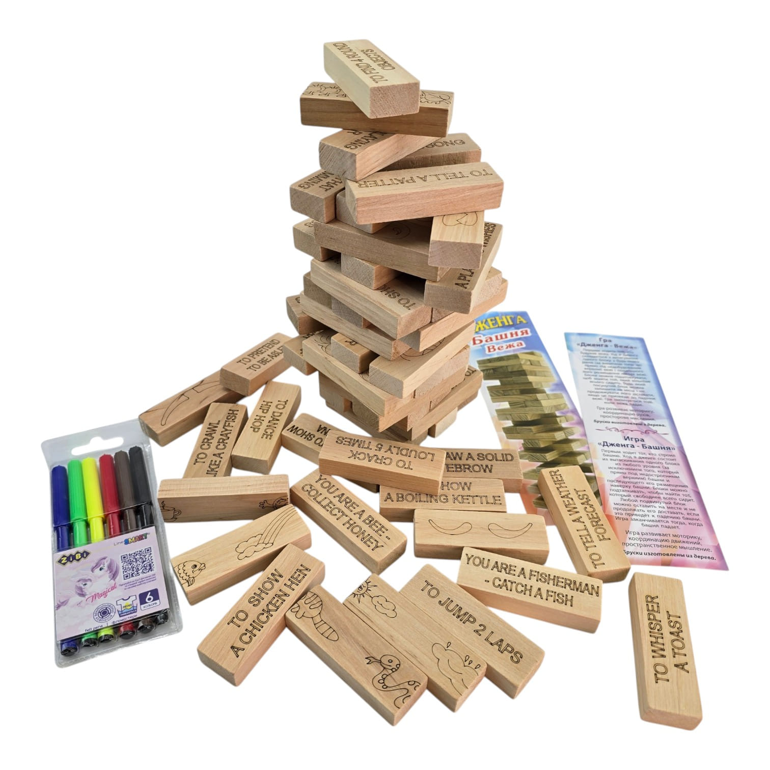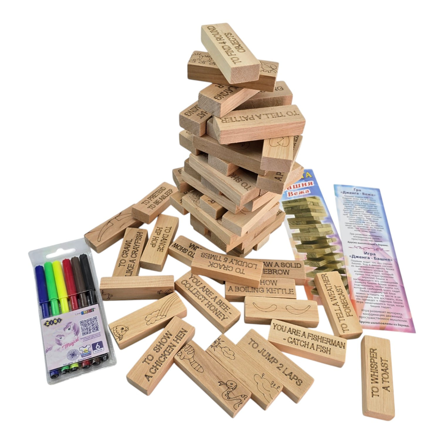Игра настольная Дженга 4в1:Башня, фанты на английском языке(60 брусков +фломастеры)(28,5х7х7 см)