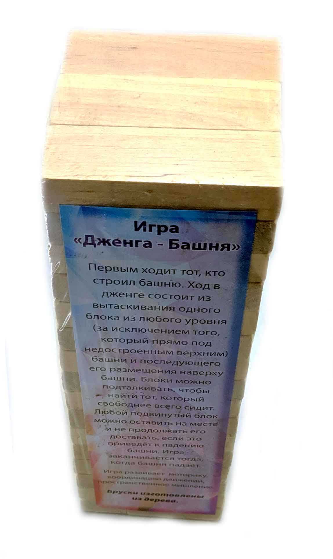 Дженга сделана из массива дерева.Дженга – это башня из деревянных брусков, которая растёт вверх, падает и снова растёт! Дженга – игра на ловкость рук, смекалку и чувство равновесия. В настольной игре Дженга (Jenga) Вам предстоит выстраивать башню из деревянных брусков, вынимая бруски с нижних «этажей» и докладывая их наверх.