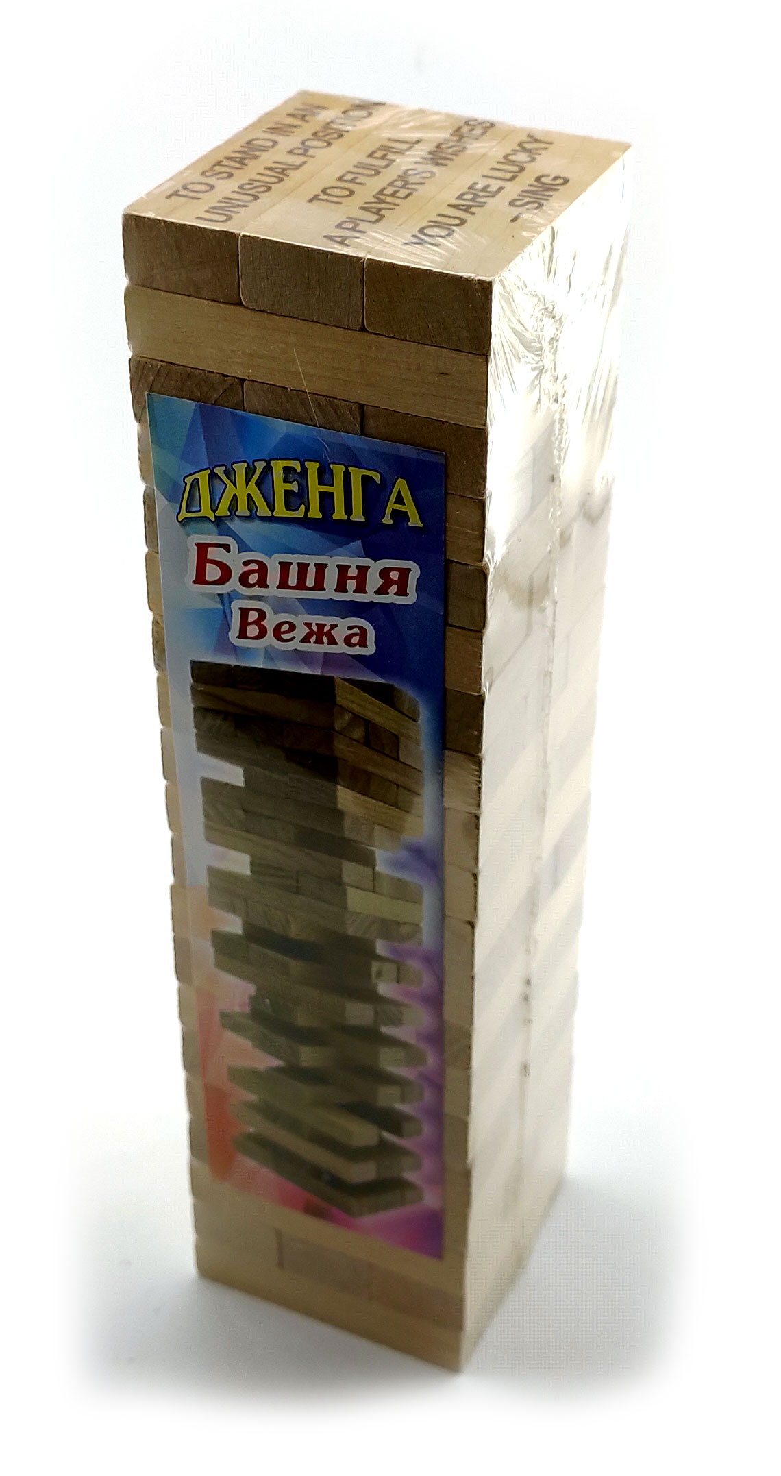 Дженга сделана из массива дерева.Дженга – это башня из деревянных брусков, которая растёт вверх, падает и снова растёт! Дженга – игра на ловкость рук, смекалку и чувство равновесия. В настольной игре Дженга (Jenga) Вам предстоит выстраивать башню из деревянных брусков, вынимая бруски с нижних «этажей» и докладывая их наверх. Возраст от 14+.