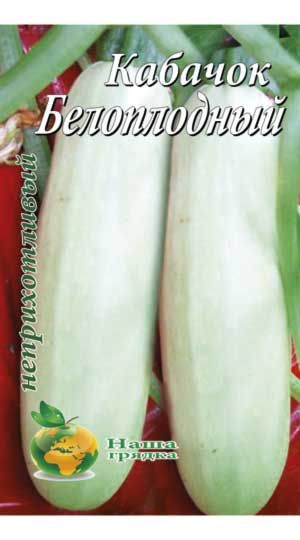 Кабачек Белоплодный .Раннеспелый, высокоурожайный сорт кабачков для открытого и закрытого грунта. Раннеспелый сорт для открытого и закрытого грунта. Период от всходов до технической спелости 36-45 дней. Растения кустового типа, боковые побеги короткие. Плод гладкий, цилиндрический, у основания слаборебристый, белёсого цвета, массой 500-900г. Мякоть кремово-белая, средней плотности, хорошего вкуса. Сорт ценится за устойчивость к бактериозу и высокую транспортабельность. Рекомендуется для переработки, консервирования и соления. Семена кабачков прошли предпосевную обработку. Семена соответствуют ДСТУ
