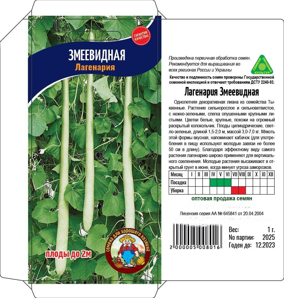 Однолетнее декоративная лиана из семейства тыквенные. Растение сильнорослое и сильноветвистое, с нежно-зелёными слегка опушенными крупными листьями. Цветки белые, крупные, похожи на огромный раскрытый колокольчик. Плоды цилиндрические, светло-зелёные, длинной 1,5-2.0м. Мякоть этой формы вкусная, напоминает кабачок.