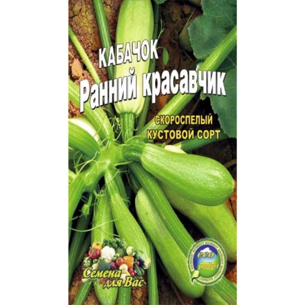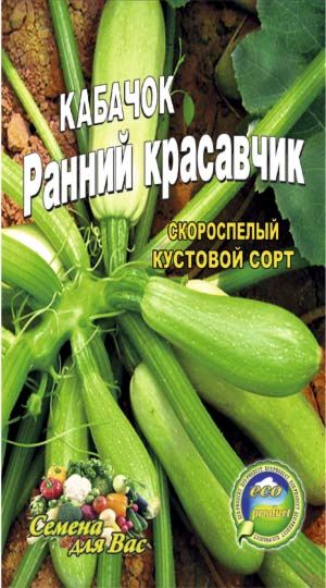 КАБАЧОК "РАННИЙ КРАСАВЕЦ" Раннеспелый, высокоурожайный сорт кабачков с длительным периодом плодоношения. Вегетационный период от всходов до сбора урожая – 42-46 дней. Предназначен для выращивания в открытом и закрытом грунте. Растение кустовое, компактное. Плоды цилиндрической формы с гладкой поверхностью, темно-зеленого цвета, средним весом 1-1,3 кг. Мякоть белая, сочная, высоких вкусовых качеств. Благодаря гармоническому сочетанию углеводов, белков, минеральных солей и ферментов, легко усваивается организмом. Для использования в свежем виде и переработки. Семена кабачков в грунт высевают в конце апреля – начале мая – после минования угрозы заморозков.