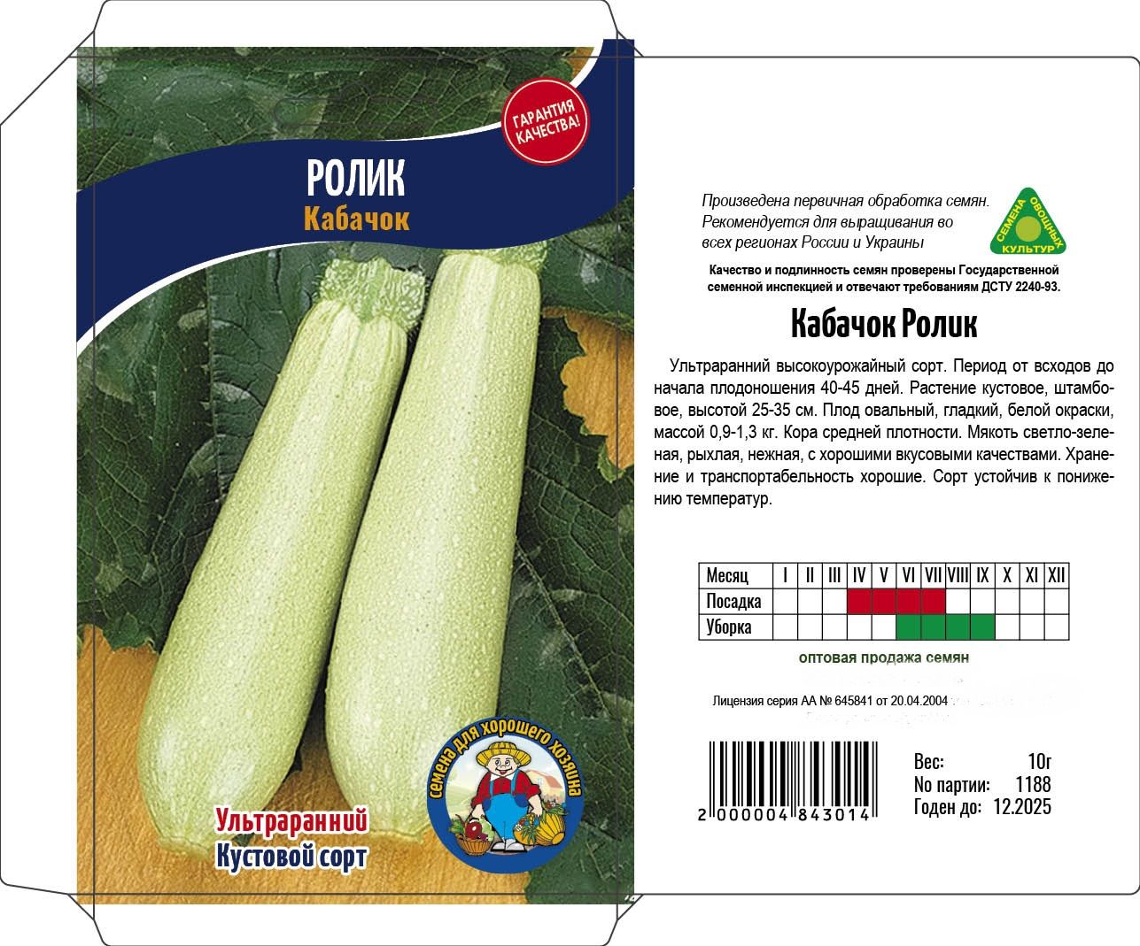 Ультраранний высокоурожайный сорт. Период от всходо до начала плодоношения 40-45 дней. Растение кустовое, штамбовое, высотой 25-35 см. Плод овальный, гладкий, белой окраски, массой 0,9-1,3 кг.