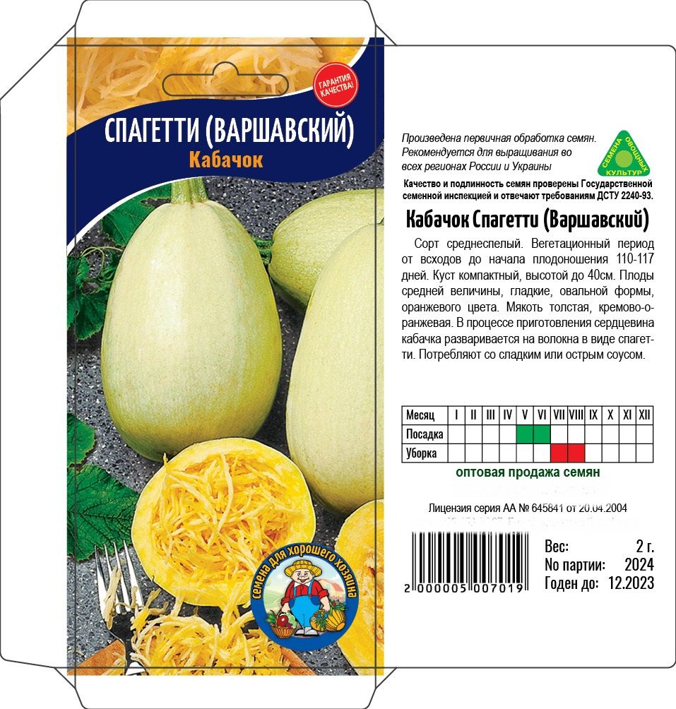 Сорт среднеспелый. Вегетационный период от всодов до начала плодоношения 110-117 дней. Куст компактный, высотой до 40 см. Плоды средней величины, гладкиие, овальной формы, оранжевого цвета. Мякоть толстая, кремового оранжевая. В процессе приготовления сердцевина кабачка разваривается на волокна в виде спагетти. Потребляется со сладким или острым соусом.
